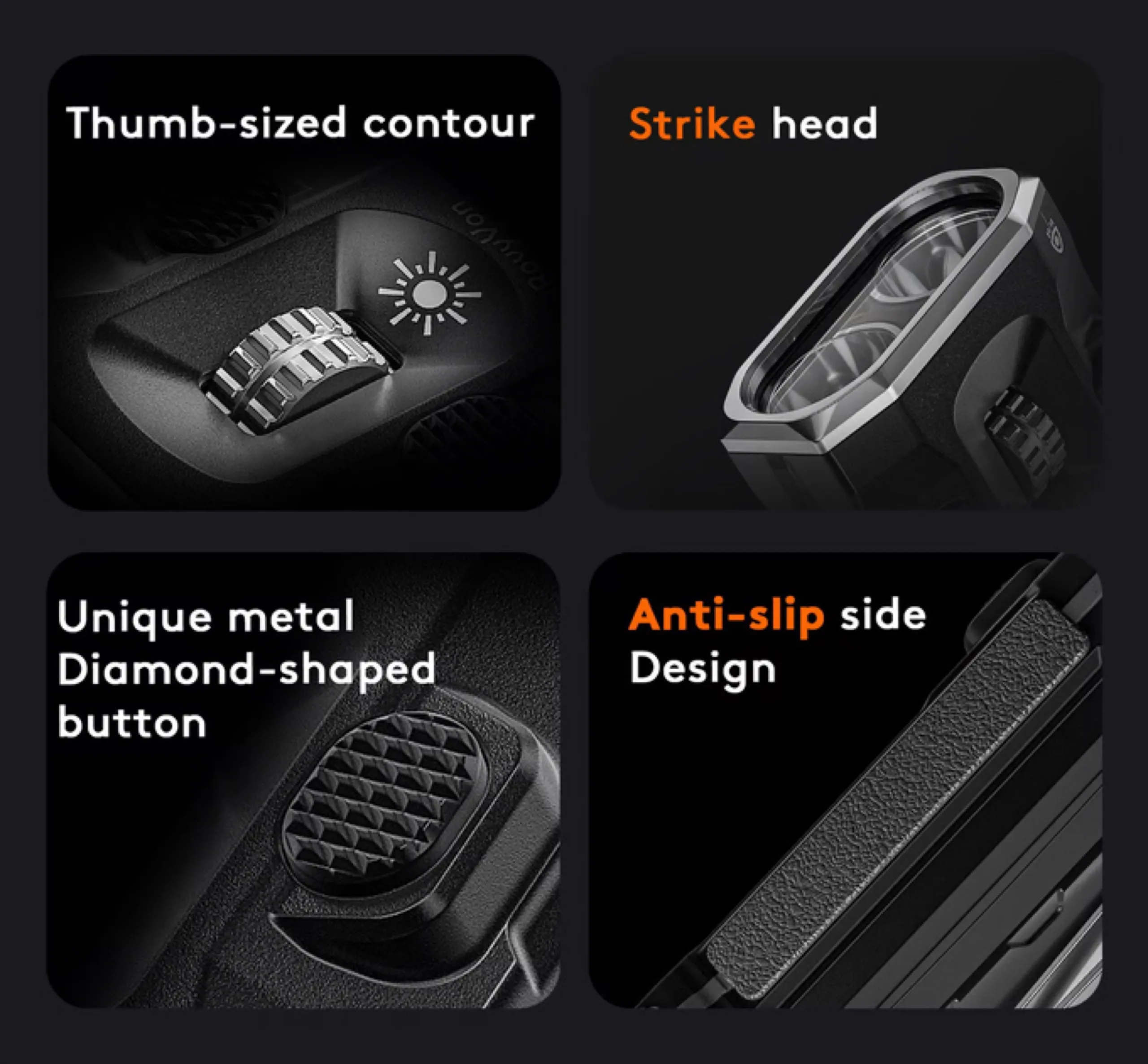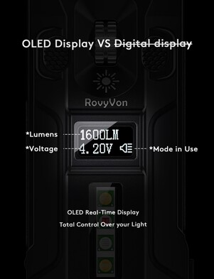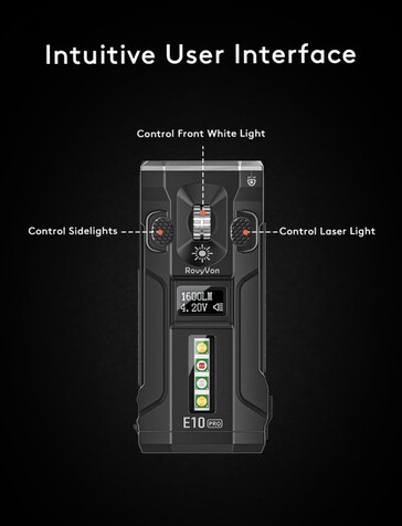 Unikalną cechą jest kółko przewijania, które umożliwia regulację jasności; kliknięcie tego kółka przełącza między różnymi trybami. Przycisk po lewej stronie kółka przewijania aktywuje "światło boczne", które znajduje się na górze RovyVon E10 Pro, podczas gdy znajduje się z boku identycznego i tak samo wycenionego E10 Max. Ta druga lampa może być używana na przykład jako ciepłe białe światło do czytania lub jako czerwony sygnał SOS.