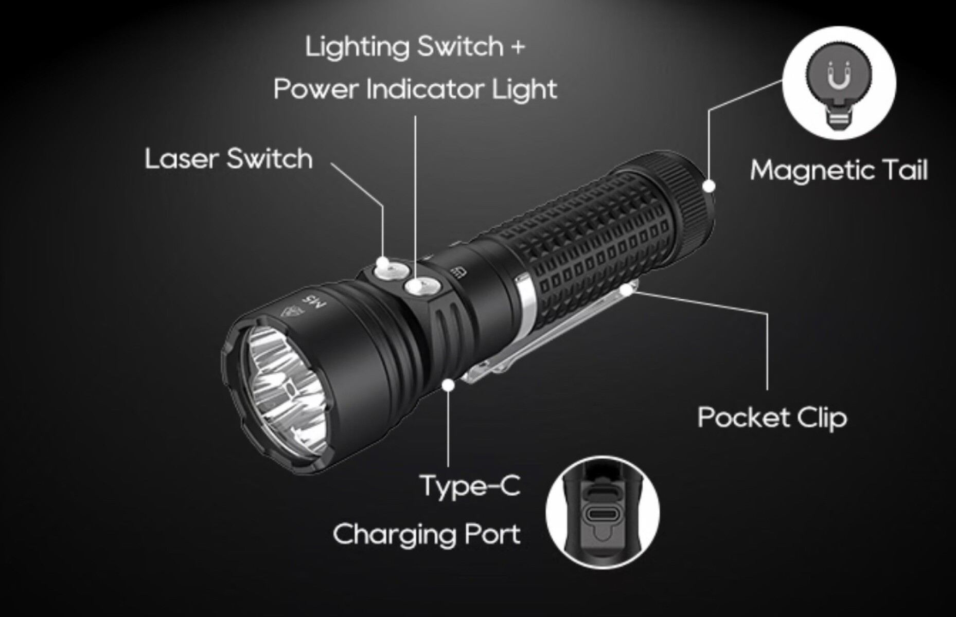 Na pierwszy rzut oka TerraBeast M5 wydaje się być raczej niepozorną latarką z czarną aluminiową obudową z certyfikatem IP66, co oznacza, że można ją upuścić do wody bez ryzyka uszkodzenia. Mniej lub bardziej niezwykłą cechą jest jednak zintegrowany laser.