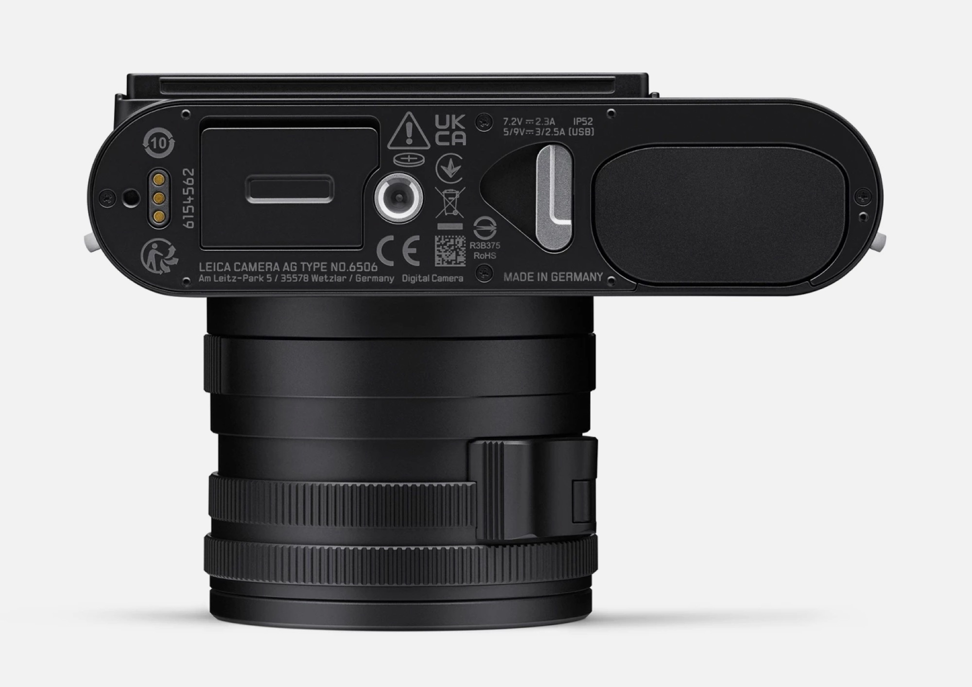 Konstrukcja na tym zdjęciu ma dwie zalety w porównaniu do Leica M11. Po pierwsze, suwak, który uwalnia baterię z korpusu, może być łatwiej obsługiwany w nowej pozycji, podczas gdy płytka szybkiego zwalniania jest przymocowana do aparatu. Po drugie, Leica dodaje trzy metalowe styki na akcesoria. W Leica Q3 są one używane do uchwytu ręcznego, który umożliwia bezprzewodowe ładowanie aparatu za pomocą podkładki ładującej Qi.