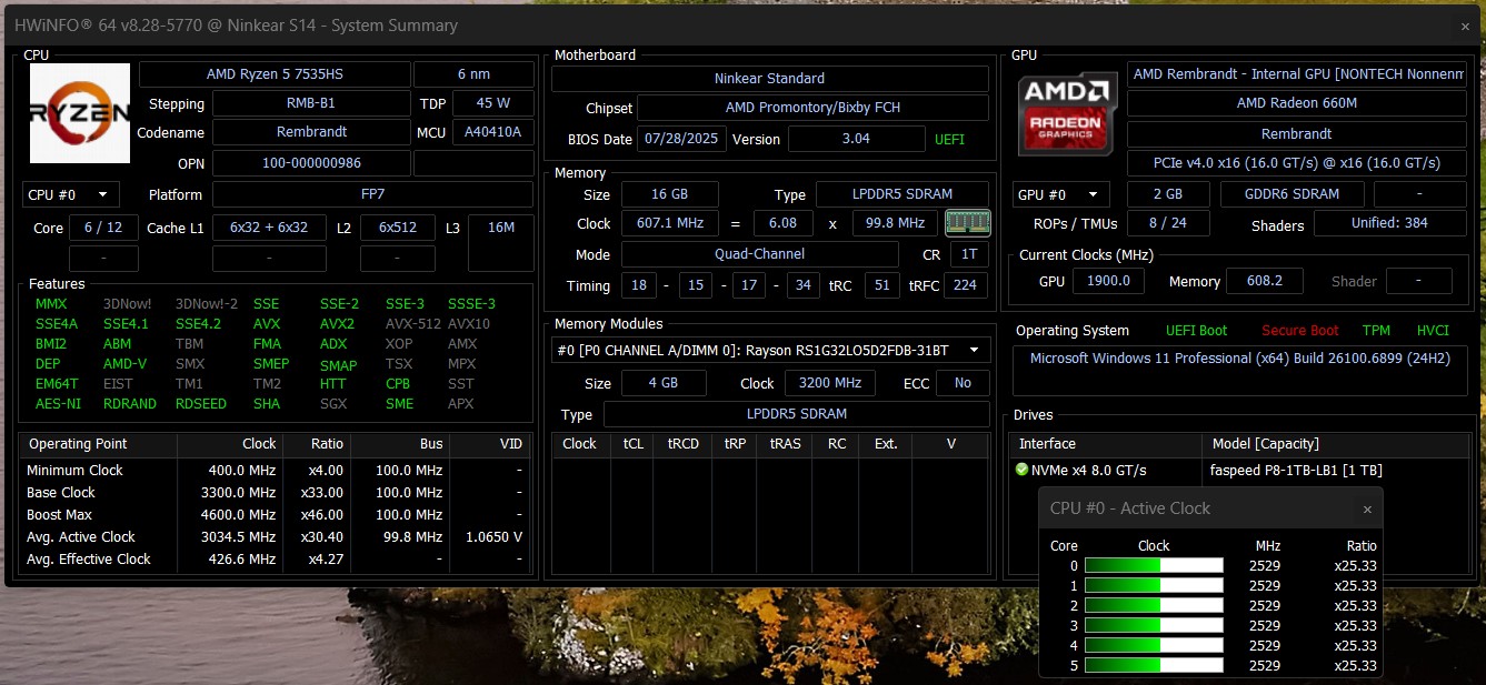 Ninkear S14 wykorzystuje AMD Ryzen 5 7535HS, potężny sześciordzeniowy procesor z dwunastoma wątkami, który osiąga taktowanie do 4,55 GHz. Procesor oferuje zatem wystarczającą wydajność dla typowych aplikacji biurowych, multimediów i lekkiej wielozadaniowości. Przy ciągłym pełnym obciążeniu wydajność jest jednak nieco ograniczona przez limit mocy systemu, co skutkuje niewielkim spadkiem wydajności w porównaniu do bardziej skonfigurowanych urządzeń.