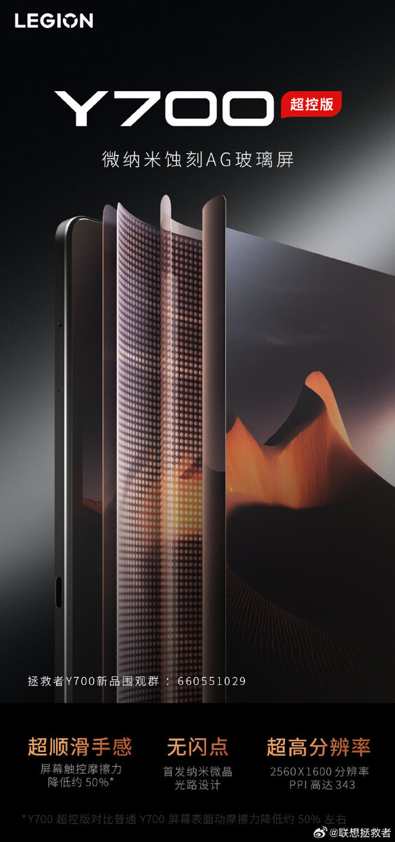 Zamiast tego ujawniła nową edycję, która obiecuje zapewnić "nowe wrażenia z gry" dzięki matowemu wykończeniu wyświetlacza. W szczególności Lenovo będzie sprzedawać tablet jako "Legion Y700 Super Control Edition", który zachowuje rozdzielczość 2560 x 1600 pikseli i 343 PPI przy proporcjach 16:10. Przypuszczalnie, Legion Y700 Super Control Edition nadal będzie miał przekątną 8,8 cala, zapewniając jednocześnie częstotliwość odświeżania 144 Hz. Nie wiadomo jednak, czy matowa powłoka wpłynie na szczytową jasność, która wynosi 500 nitów.