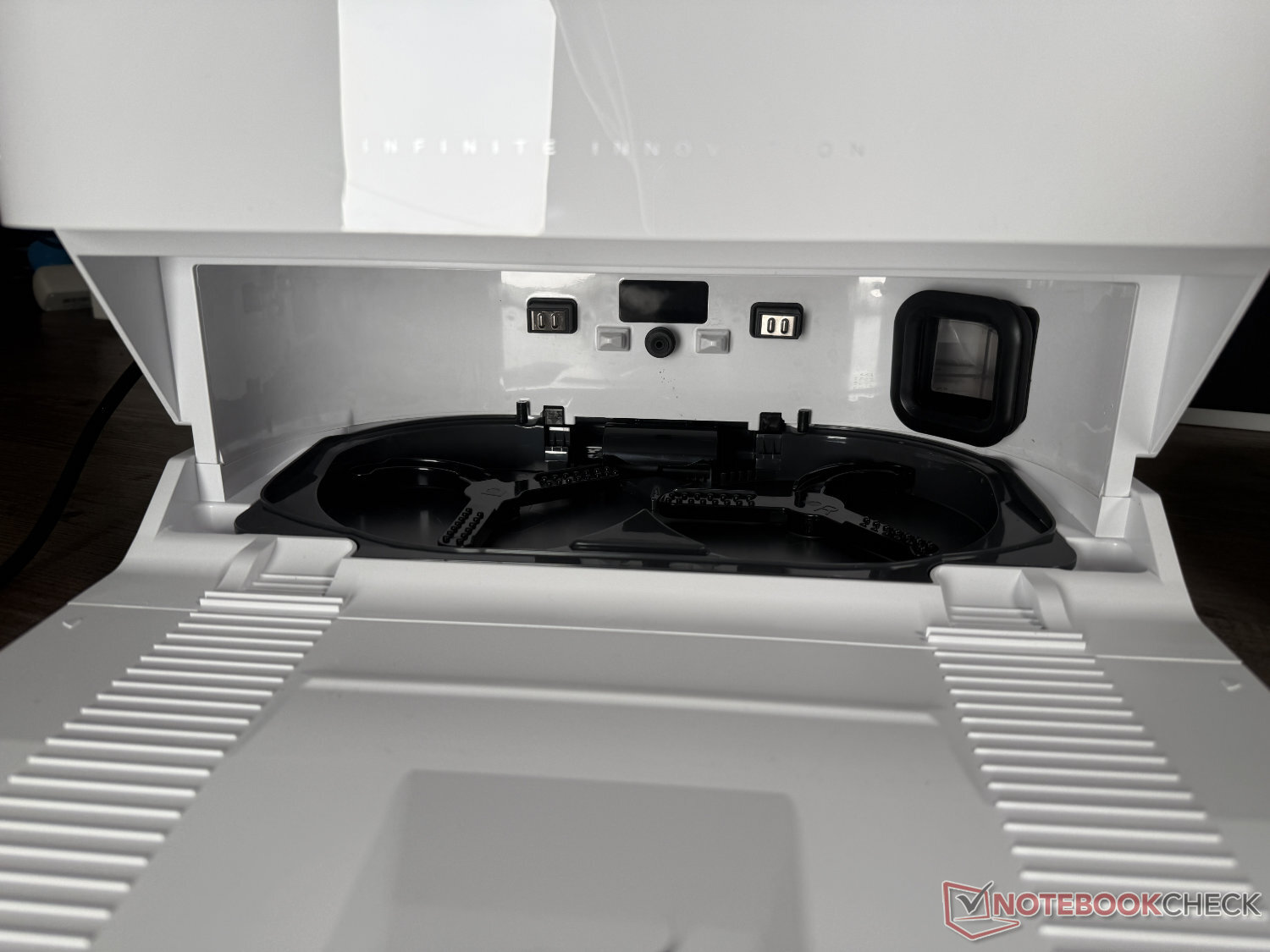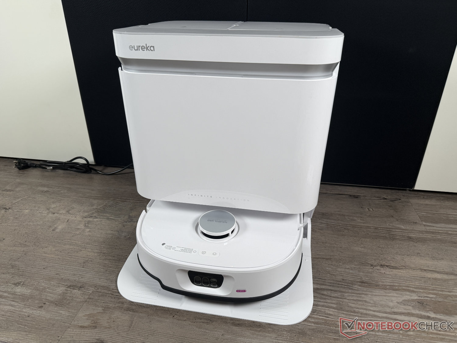 Eureka J15 Max Ultra jest dostarczana ze stacją samoczyszczącą. Poza tym - pomijając brak automatycznego dozowania detergentu - mopy czyści się jak zwykle wodą podgrzaną do 80°C, a następnie suszy powietrzem ogrzanym do 55°C. Wizualnie podstawa ma raczej prosty i atrakcyjny wygląd. To, co nieco psuje wygląd w naszych oczach, to fakt, że biała wersja ma czarny kabel zasilający.
