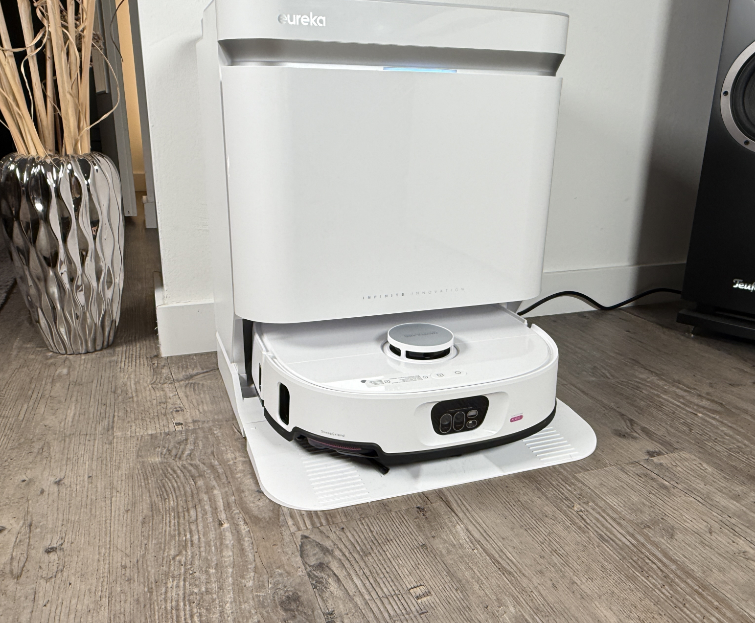 Dzięki wysuwanej szczotce bocznej, która tutaj wygląda jak pazur z trzema palcami, oraz mopowi, który wysuwa się z boku obudowy, Eureka obiecuje czystość w rogach i wzdłuż krawędzi. IntelliView AI 2.0, który służy również do wykrywania przeszkód i składa się z niewysuwanej wieży laserowej na robocie i modułu kamery z przodu. Wyposażenie obejmuje również technologię podwójnego rozplątywania i przekraczania progu do 45 mm.