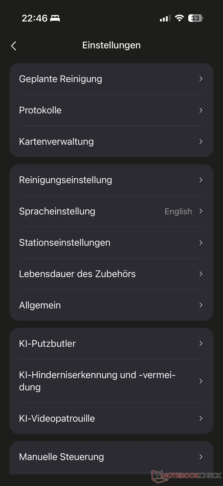 Liczne opcje ustawień pojawiają się w menu w prawym górnym rogu. Oprócz harmonogramu i protokołów czyszczenia, dostępne są zwykłe i ważne opcje dostosowywania czyszczenia (w tym indywidualne ustawienia dla poszczególnych dywanów), wykrywanie przeszkód AI, stacja i inne. Zirytował nas fakt, że dostęp do transmisji wideo na żywo działał bez wcześniejszej aktywacji, w tym kodu bezpieczeństwa. Brakowało nam również sterowania głosowego. Dostępna jest jedynie informacja głosowa w języku niemieckim.