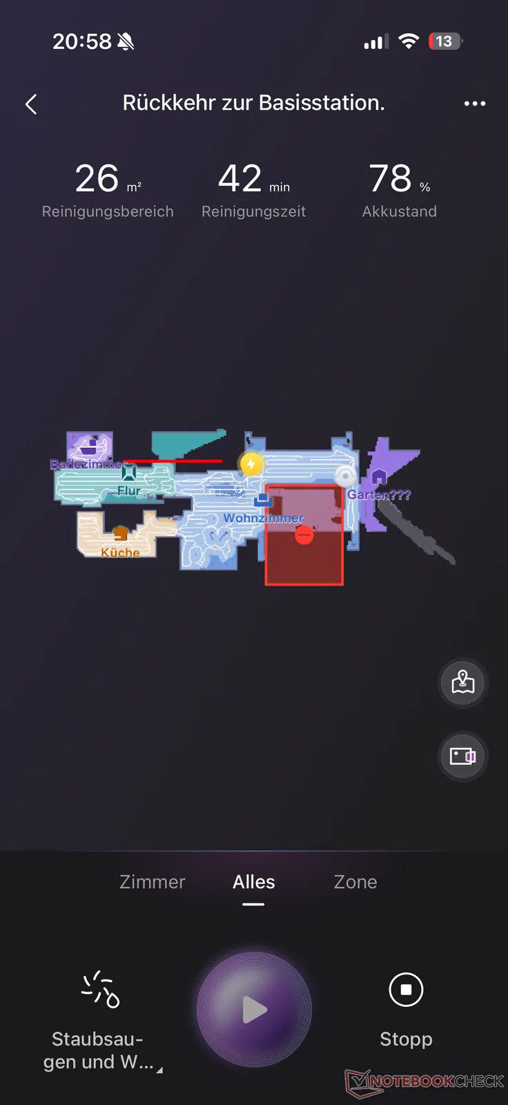 Po tym następuje zwykłe mapowanie dla wszystkich robotów odkurzających. Tutaj J15 Max Ultra tworzy wirtualną mapę swojego "nowego terytorium" w ciągu kilku minut. Automatyczny podział pomieszczeń nie działał szczególnie dokładnie. Między innymi okno zamknięte roletą zostało uznane za inne pomieszczenie za nim na podstawie odbicia. Większość niedokładności można jednak dostosować do rzeczywistych warunków za pomocą zarządzania mapą, w tym stref ograniczonego dostępu, progów, podłóg i mebli. Ogólnie jednak bardziej podobało nam się dostosowywanie mapy za pomocą jednego lub drugiego producenta, również ze względu na czasami dość długi czas ładowania aplikacji.