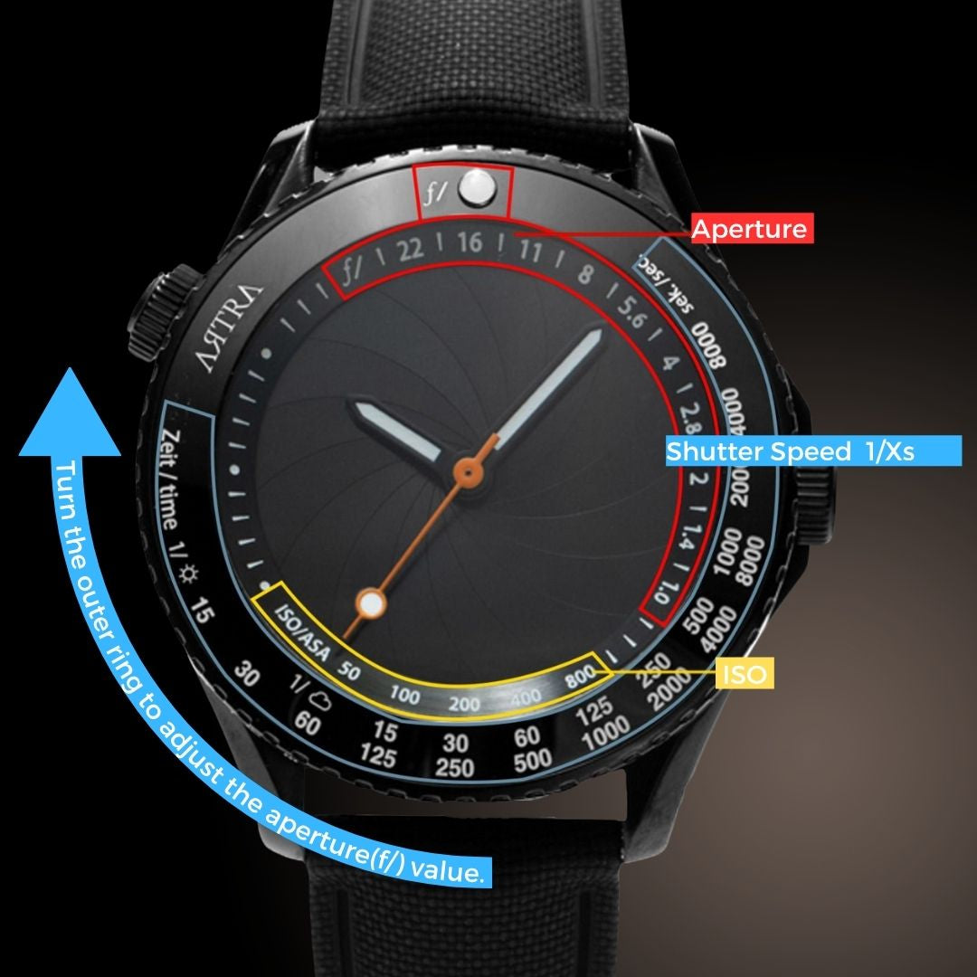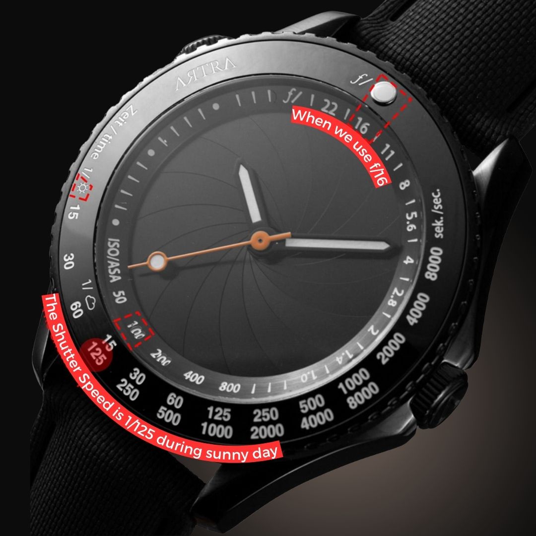 Elementy te pełnią nie tylko funkcję dekoracyjną, ale także pozwalają użytkownikowi obliczyć prawidłowy czas otwarcia migawki dla właściwej ekspozycji. Na przykład, czytając maskownicę od wewnątrz na zewnątrz, można zobaczyć, że przy ISO 400 i f/16, prawidłowy czas otwarcia migawki wynosi 1/500 s w świetle słonecznym i 1/60 s w cieniu. Wybraną przysłonę można regulować obracając bezel. Zegarek posiada kopertę ze stali nierdzewnej, która jest wodoodporna do 50 metrów, a tarcza jest chroniona szafirowym szkiełkiem