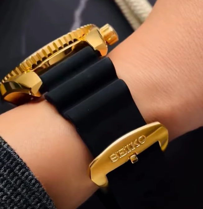 Jednym z ważniejszych punktów oryginalnej prezentacji było opakowanie. Seiko Thailand dostarcza limitowaną edycję Muay Thai w specjalnym pudełku z zegarkiem na złotej bransolecie oraz dodatkowym czarnym gumowym paskiem i pasującą złotą klamrą. Praktyczny klip skupia się na tej drugiej opcji. Na nadgarstku gumowy pasek nieco tonuje ogólny wygląd, sprawiając, że zegarek bardziej przypomina codziennego nurka z efektowną kopertą niż pełną biżuterię na nadgarstek. Pasek lekko zwęża się w kierunku sygnowanej złotej klamry, na której wygrawerowano logo Seiko.