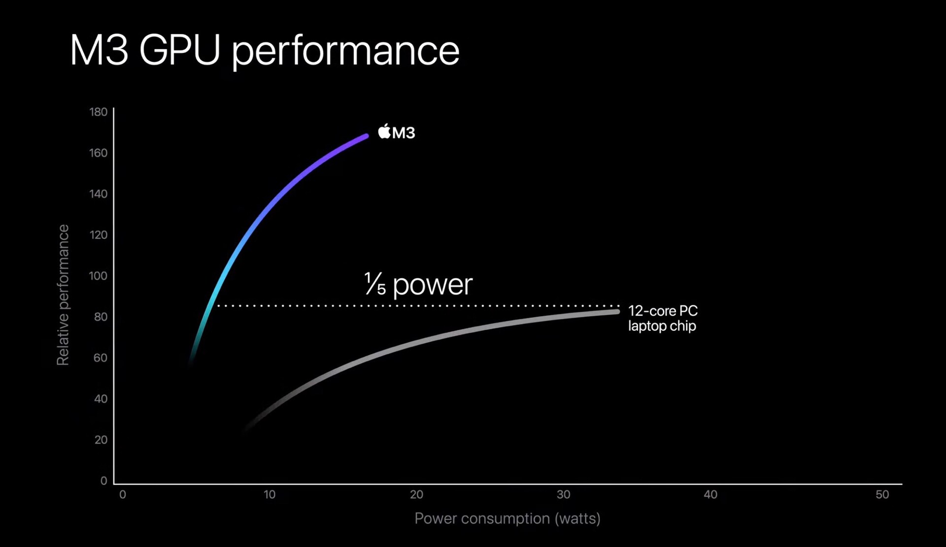 Appleporównania wydajności są również nieco wątpliwe. Zamiast konkurować z Apple M2 lub AMD Ryzen 7040U, Apple używa przestarzałego Apple M1 i prawie notorycznie nieefektywnegoIntel Core i7-1360P dla porównania. Według własnych danych Apple, Apple M3 osiąga taką samą wydajność CPU jak Core i7-1360P przy jednej czwartej zużycia energii, a nawet przy jednej piątej rozpraszania energii przez GPU.