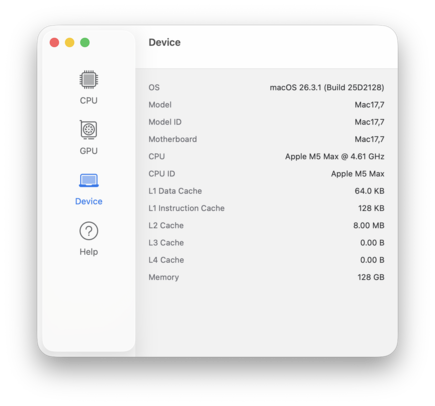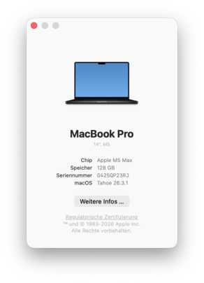 Subiektywne wrażenia z wydajności są doskonałe, ale prawdę mówiąc, dotyczy to każdego nowoczesnego MacBooka z układem M5, ponieważ wysoka wydajność jednordzeniowa (w połączeniu z szybką pamięcią masową SSD) jest kluczowym czynnikiem dla codziennych obciążeń. Z naszą maksymalną jednostką testową (128 GB RAM) nie będą mieli Państwo żadnych problemów podczas ciężkiej wielozadaniowości i nie ma zbyt wielu innych urządzeń z tak dużą ilością pamięci RAM, zwykle tylko systemy AMD Strix Halo, takie jak Asus ProArt PX13. Wydajność pamięci pozostała prawie taka sama w porównaniu do poprzedniego SoC M4 Max.