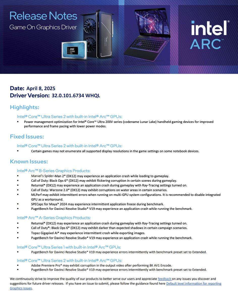Na pierwszy rzut oka sterownik Intel Graphics Driver 32.0.101.6734 jest skierowany do iGPU w procesorach Core od 11. do 14. generacji, a także procesorach Arrow Lake, Lunar Lake i Meteor Lake z rodziny Core Ultra. Dla porównania, aktualizacja ma również ulepszyć karty graficzne Arc i Iris Xe w różnych obszarach.