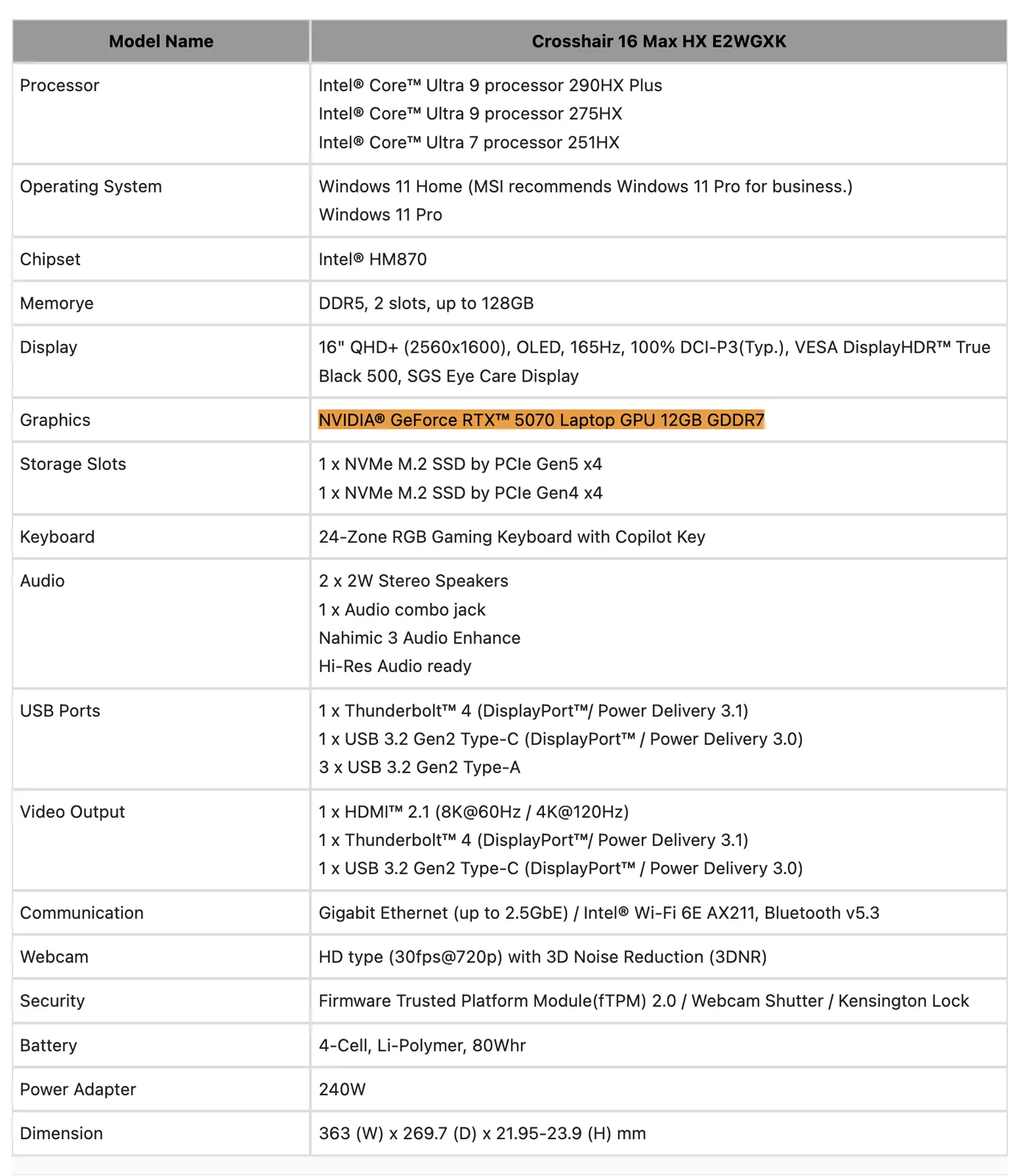 Dzisiejsze ogłoszenie zawiera odniesienie do GPU, którego Nvidia jeszcze oficjalnie nie ujawniła. Mianowicie, MSI wspomina, że jego Crosshair 16 Max HX E2WGXK będzie dostępny wyłącznie z "Nvidia GeForce RTX 5070 Laptop GPU 12GB GDDR7".