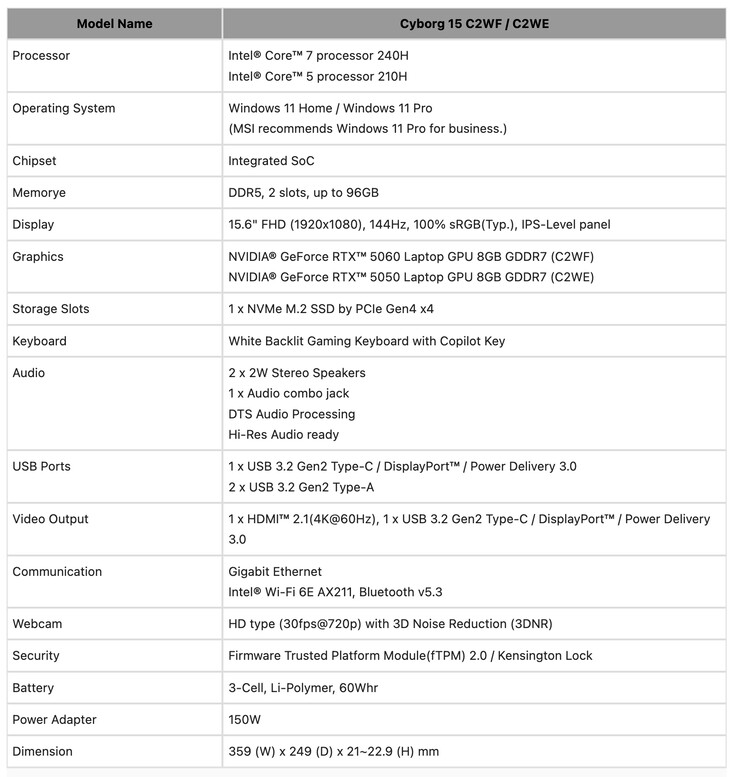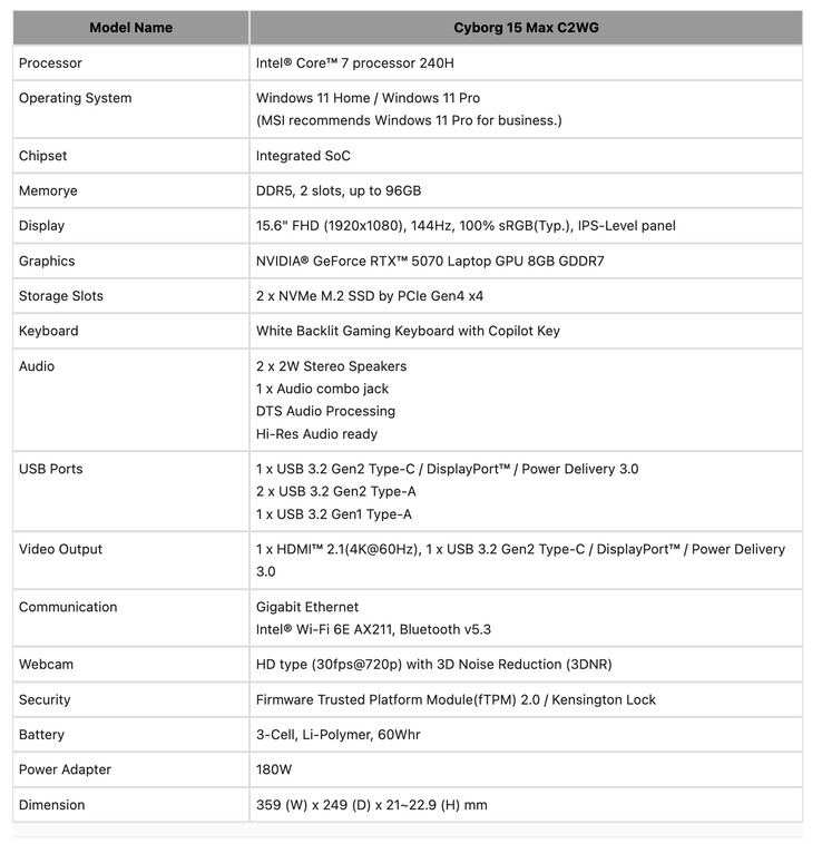 W tym samym czasie MSI zaktualizowało Crosshair 16 HX o warianty E14WGK, E14WFK i E14WEK wykorzystujące procesory Core i7 14650HX lub Core i9-14900HX oraz 8 GB wersje kart graficznych GeForce RTX 5050, GeForce RTX 5060 lub GeForce RTX 5070. Ponadto, MSI ujawniło również trzy nowe 15-calowe laptopy Cyborg o nazwach Cyborg 15 Max, C2WG Cyborg 15 C2WF i Cyborg 15 C2WE z podobną specyfikacją jak zeszłoroczne modele (obecnie 1,299 USD na Amazon). MSI nie potwierdziło jeszcze cen ani dostępności nowych modeli. Proszę zapoznać się z komunikatem prasowym firmy https://www.msi.com/news/detail/MSI-Unveils-New-Raider-and-Crosshair-Gaming-Laptops-with-Up-to-300W-Combined-Power--Delivering-Industry-leading-Performance--148460 gdzie znajdą Państwo więcej szczegółów.