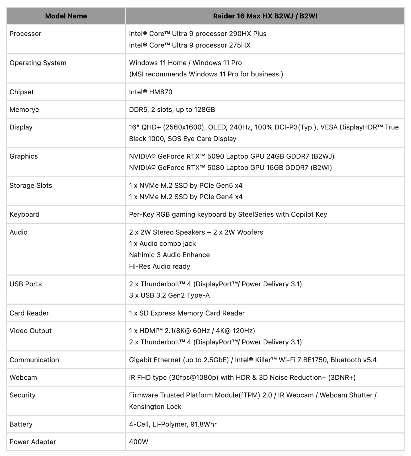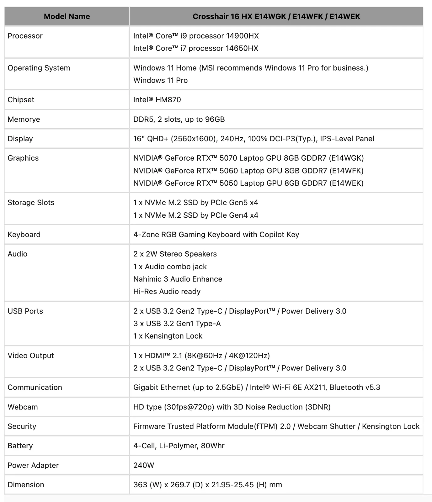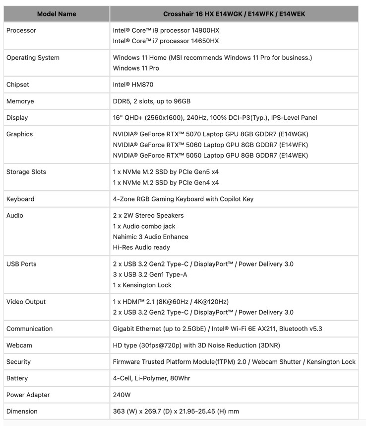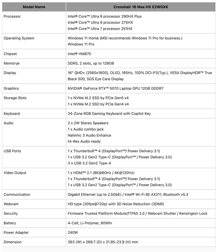 Nawiasem mówiąc, Crosshair 16 Max HX E2WGXK jest pierwszym laptopem, którego premierę potwierdzono z kartą graficzną Nvidii niewydany laptop z 12 GB RTX 5070 GPU. Tymczasem pozostałe siedem laptopów wymienionych powyżej posiada albo GeForce RTX 5070 Ti, GeForce RTX 5080 lub GeForce RTX 5090.
