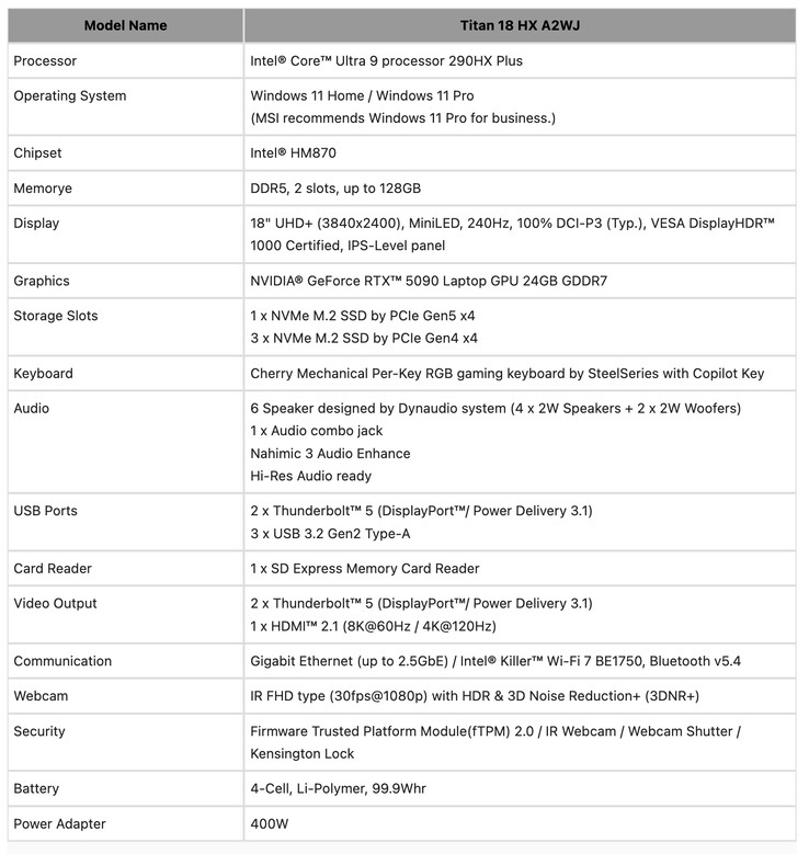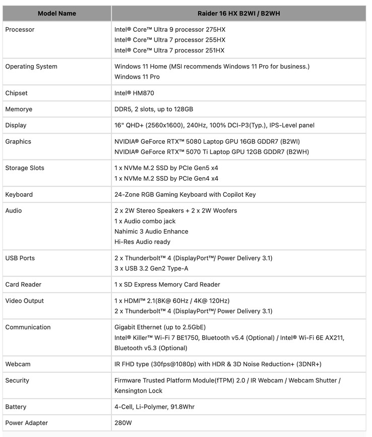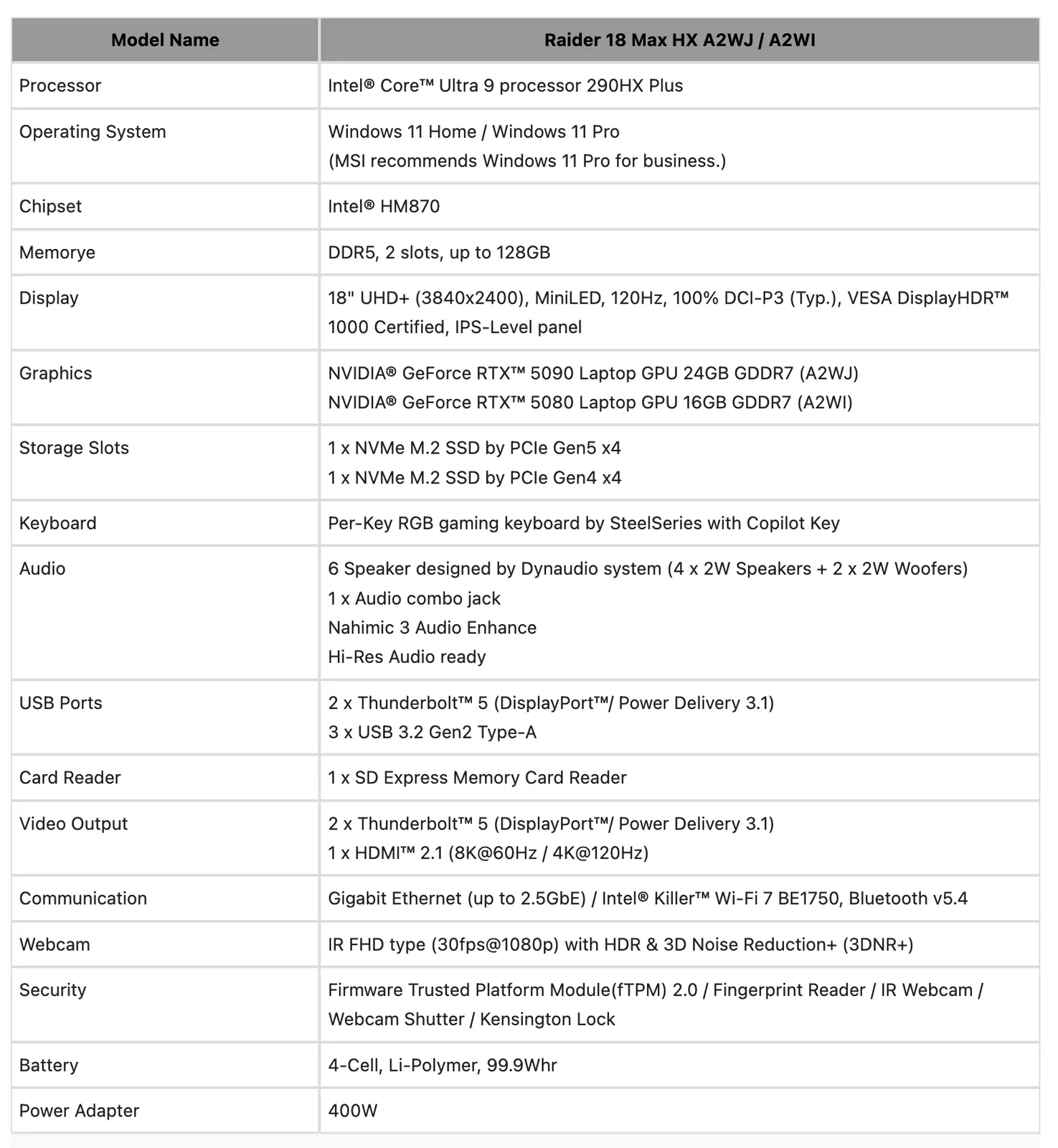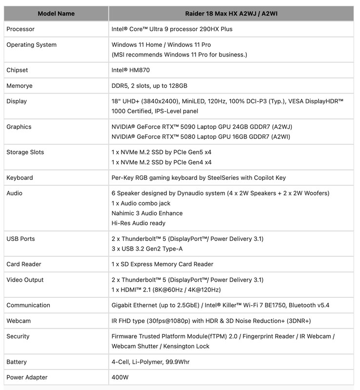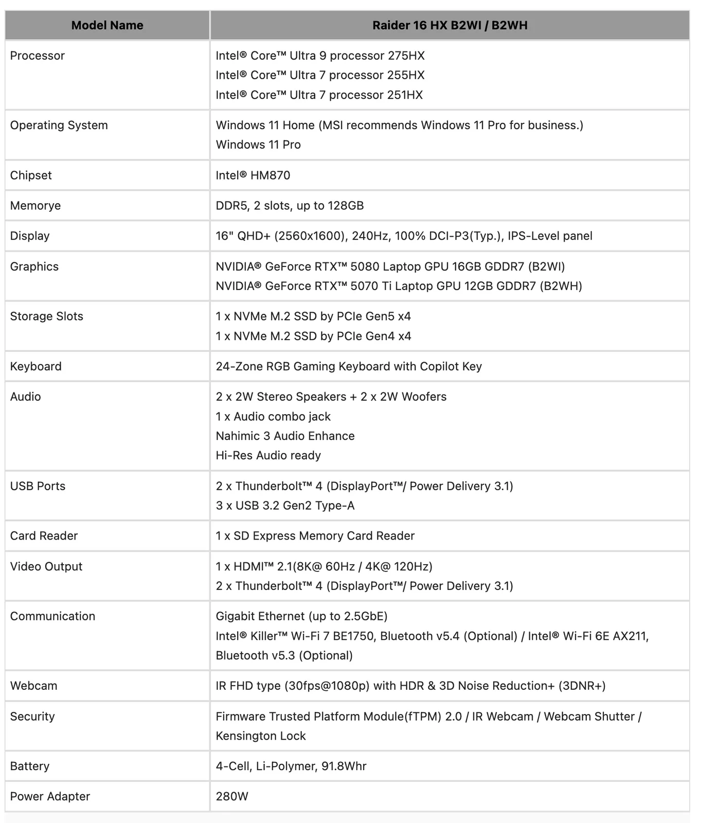 Nawiasem mówiąc, Crosshair 16 Max HX E2WGXK jest pierwszym laptopem, którego premierę potwierdzono z kartą graficzną Nvidii niewydany laptop z 12 GB RTX 5070 GPU. Tymczasem pozostałe siedem laptopów wymienionych powyżej posiada albo GeForce RTX 5070 Ti, GeForce RTX 5080 lub GeForce RTX 5090.