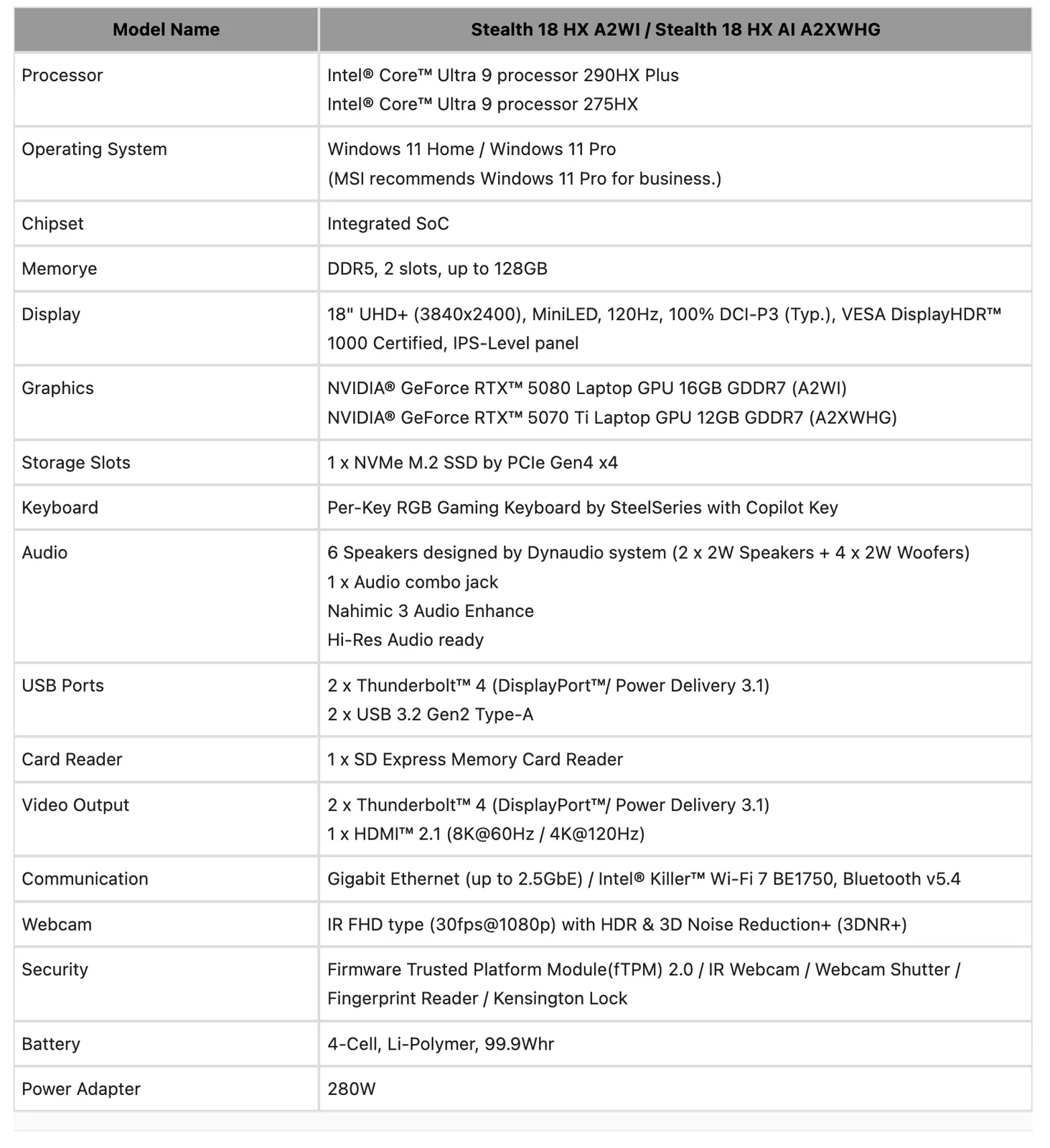Teraz MSI dołączyło do imprezy z ośmioma nowymi laptopami z serii Raider i Stealth Titan. W szczególności firma zaprezentowała następujące laptopy wspierane przez Core Ultra 9 290HX Plus procesory: