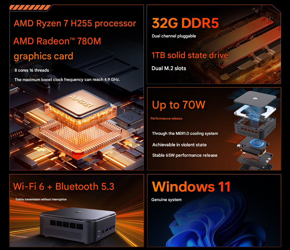 Procesor ten jest przebrandowaną wersją Ryzen 7 8745HS i chociaż został wprowadzony na rynek jako procesor tylko dla Chinproducenci mini PC zaczęli oferować systemy z nim na rynku globalnym. Beelink Ser9 Pro i Minisforum X1 to dwa przykłady takich komputerów.