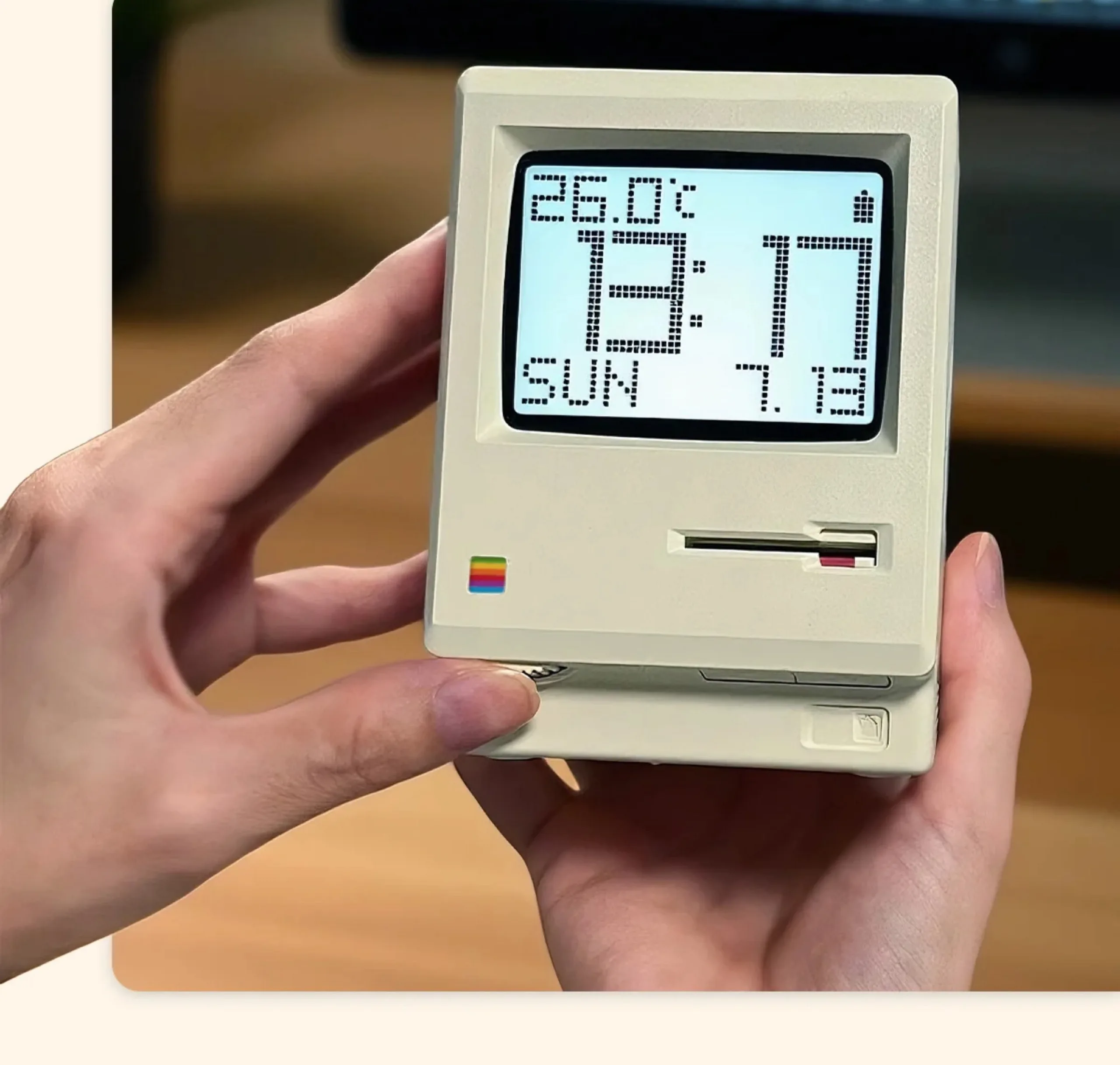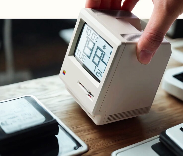 Zegar cyfrowy włącza się poprzez włożenie dołączonej dyskietki do wyznaczonego gniazda pod wyświetlaczem. Pokrętło pod ekranem umożliwia regulację jasności wyświetlacza. Z tyłu znajduje się port USB-C do ładowania oraz przycisk do włączania i wyłączania zegara. Zintegrowana bateria o pojemności 1200 mAh ma zapewnić do 60 dni pracy przy wyłączonym podświetleniu