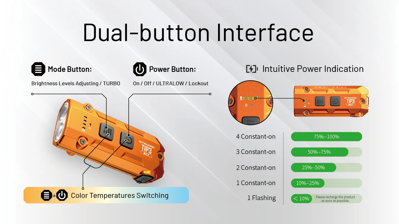 Nitecore udało się również potroić maksymalny czas pracy w niektórych przypadkach. W najciemniejszym trybie, przy jednym lumenie, nowy TIP3 zarządza czasem pracy wynoszącym 160 godzin. Z drugiej strony TIP 1 SE zarządza tylko 50 godzinami. Pokazuje to, jak bardzo Nitecore poprawił wydajność diod LED w warunkach słabego oświetlenia.