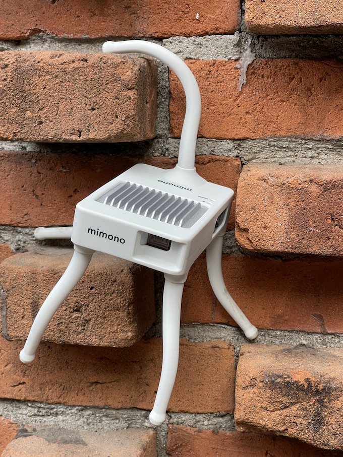 Gadżet ma nietypową obudowę z czterema zginanymi miedzianymi nogami i ogonem, wszystkie zamknięte w silikonie. W zależności od konfiguracji można użyć kończyn, aby dostosować wysokość i pozycję projektora. Na przykład, firma sugeruje użycie nóg do umieszczenia projektora na drzewie, aby uzyskać wrażenia kina plenerowego. Ponadto projektor inteligentnie rozpoznaje, kiedy urządzenie zostało odwrócone do góry nogami i automatycznie odwraca ekran. Aby otrzymać projektor laserowy Mimono, którego cena detaliczna wynosi zazwyczaj 799 USD, można wpłacić 679 USD na kampanię https://www.kickstarter.com/projects/mimono/mimono-laser-projector