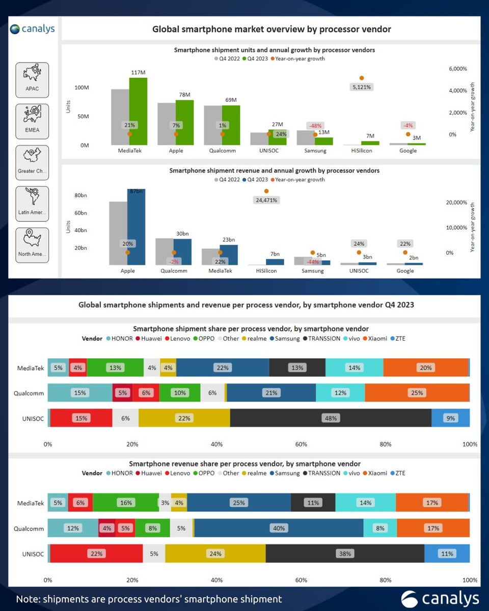 Unisoc był wschodzącą gwiazdą w tym raporcie z przychodami i dostawami, które wzrosły o 24% rok do roku (choć odpowiednio do 3 miliardów dolarów i 27 milionów). Większość jej działalności stanowiły urządzenia Marki Transsion jednak z markami Realme i Lenovo przynosząc tył dla swoich rzekomo budżetowych smartfonów z 4Q2023.
