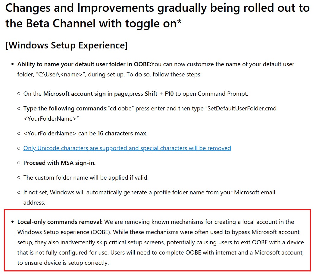 W poprzednich wersjach firma zablokowała popularne polecenie OOBEbypassnro, które pozwalało użytkownikom pominąć część początkowego procesu konfiguracji. Ostatecznie pozwoliło to na utworzenie konta offline. Teraz Microsoft podwoił swoje stanowisko.