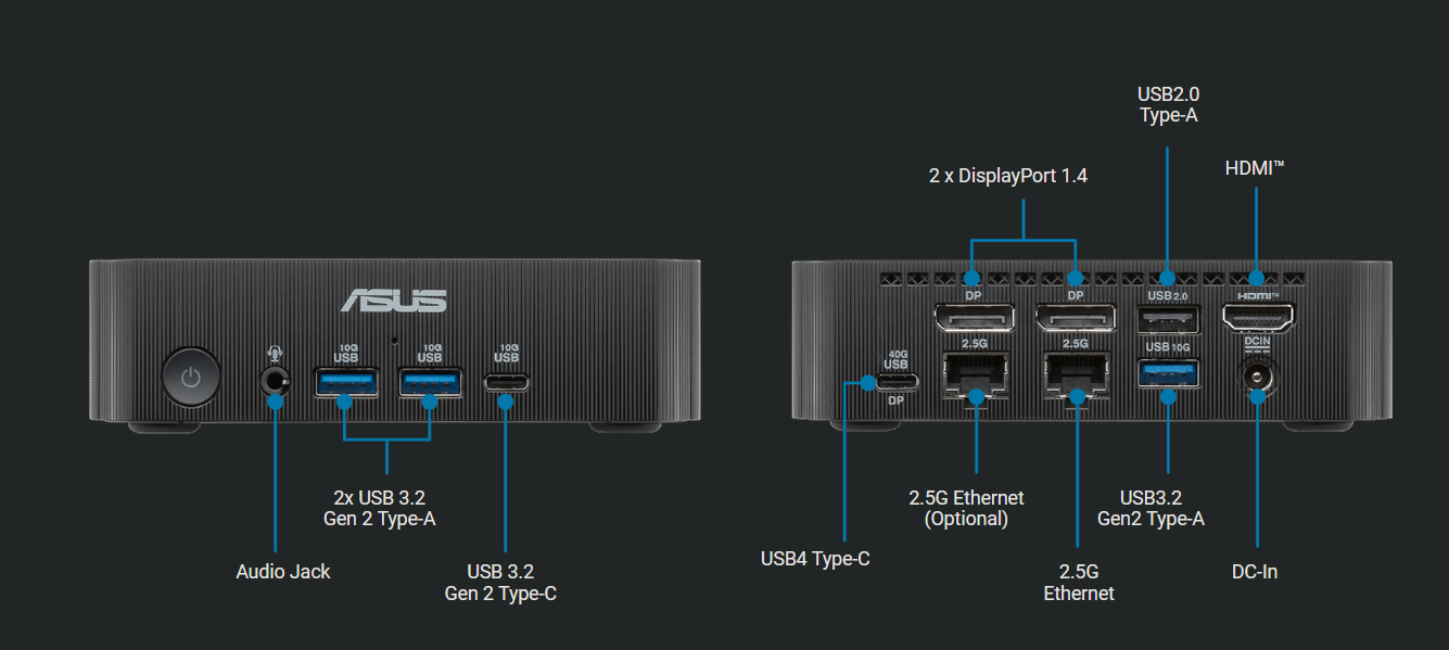 Opcje łączności obejmują Wi-Fi 7 (lub Wi-Fi 6E), Bluetooth 5.4 i dwa porty Ethernet 2,5 Gb/s. Asus oferuje szeroką gamę wejść/wyjść w ExpertCenter PN54-S1, w tym USB 4.0, USB 3.2 Gen Type-A, USB 3.2 Gen 2 Type-C, USB 2.0, HDMI 2.1 i DisplayPort 1.4.
