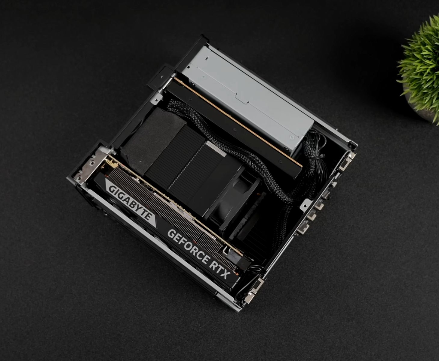 YouTuber rozpoczyna wideo od rozebrania MS-02 Ultra, co jest zaskakująco łatwe, ponieważ odkręcenie tylko dwóch śrub pozwala na zsunięcie wewnętrznej ramy. Wewnątrz, chłodzenie procesora i zasilacz 350 W zajmują większość miejsca, pozostawiając tylko wystarczająco dużo miejsca na niskoprofilową kartę graficzną, a jak widać na powyższym obrazku, jest to RTX 5060 LP jest bardzo ciasno wpasowany.