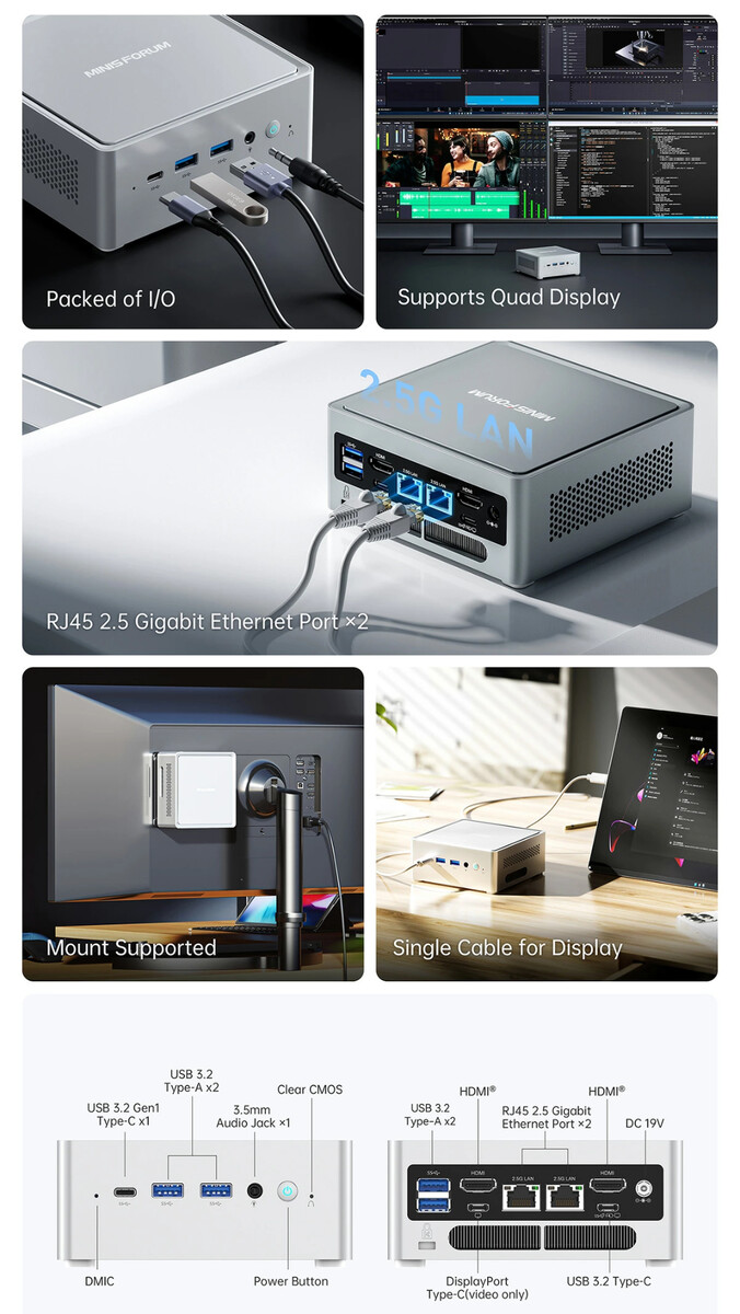 Co więcej, NAB3R obsługuje możliwość rozbudowy pamięci masowej i pamięci RAM, aczkolwiek tylko do 64 GB DDR4-3200 w przypadku tej drugiej. Niemniej jednak, Minisforum dołączyło aktywne rozwiązanie chłodzące dla dysku SSD M.2 2280 mini-PC, a także duży wentylator turbo na spodzie. Jak pokazuje poniższy obrazek, NAB3R nie brakuje również portów z tyłu.