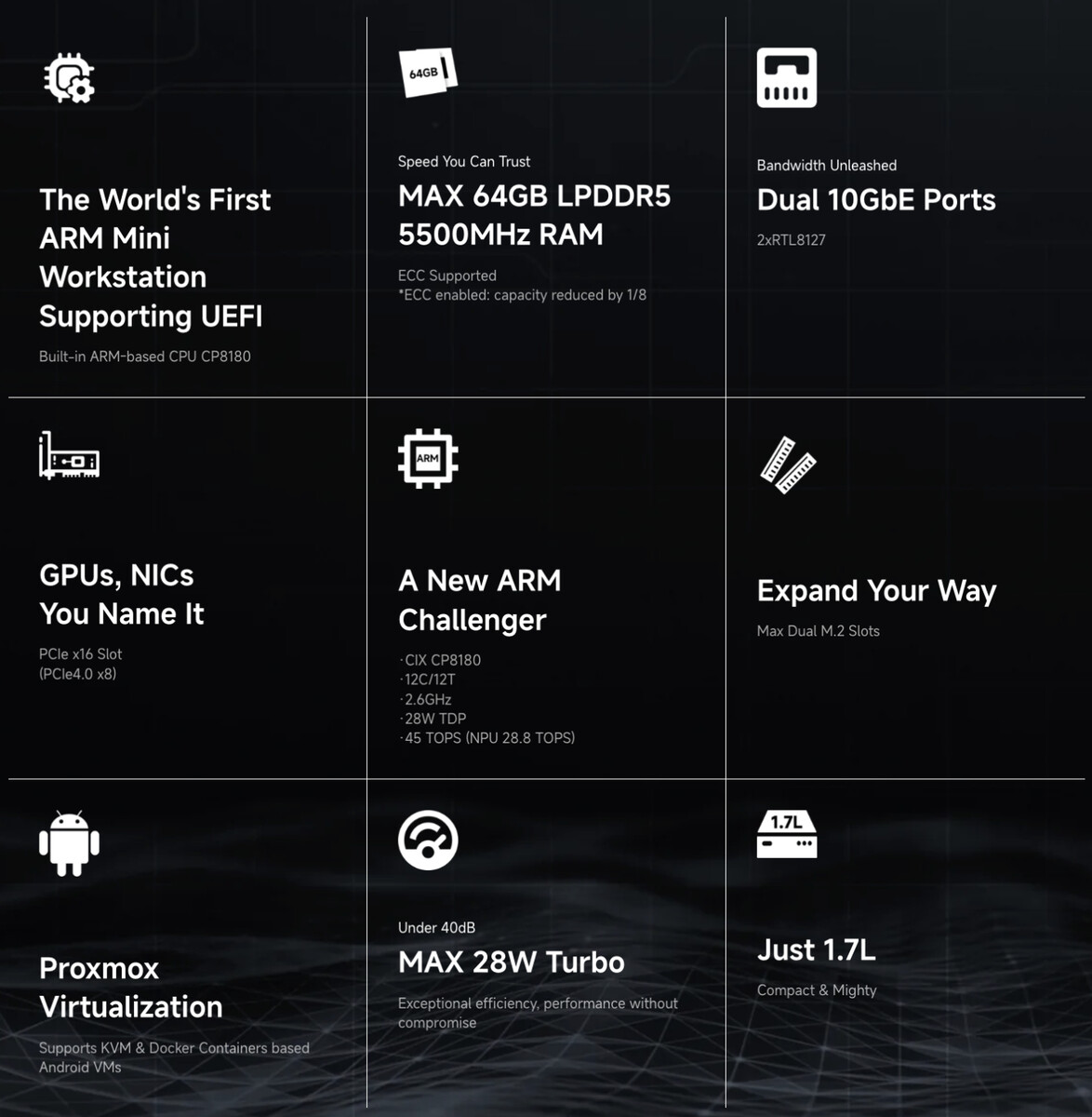Opisywany jako nowy "pretendent ARM" z "poważną mocą", MS-R1 wygląda jak zwykły mini-PC lub mini stacja robocza na powierzchni, z skromnym wyglądem i obudową o pojemności 1,7 litra. Nowe urządzenie wykorzystuje jednak CIX CP8180, 12-rdzeniowy i 12-wątkowy chipset z TDP na poziomie 28 W.