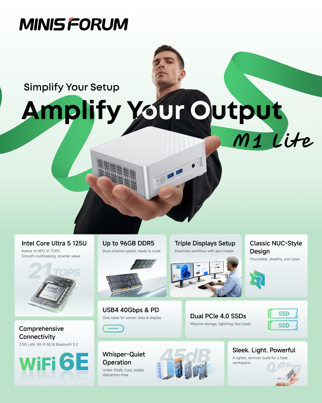 Co więcej, M1 Lite wykorzystuje aktywne chłodzenie, które powinno działać na poziomie poniżej 45 dB nawet przy pełnym obciążeniu. Cena M1 Lite zaczyna się od 311 USD w Stanach Zjednoczonych jako system barebone bez pamięci masowej, pamięci RAM, a nawet zainstalowanego systemu operacyjnego. Alternatywnie, mini-PC można nabyć z dyskiem SSD o pojemności 512 GB, 16 GB pamięci RAM i licencją Windows 11 Pro za 615 USD.