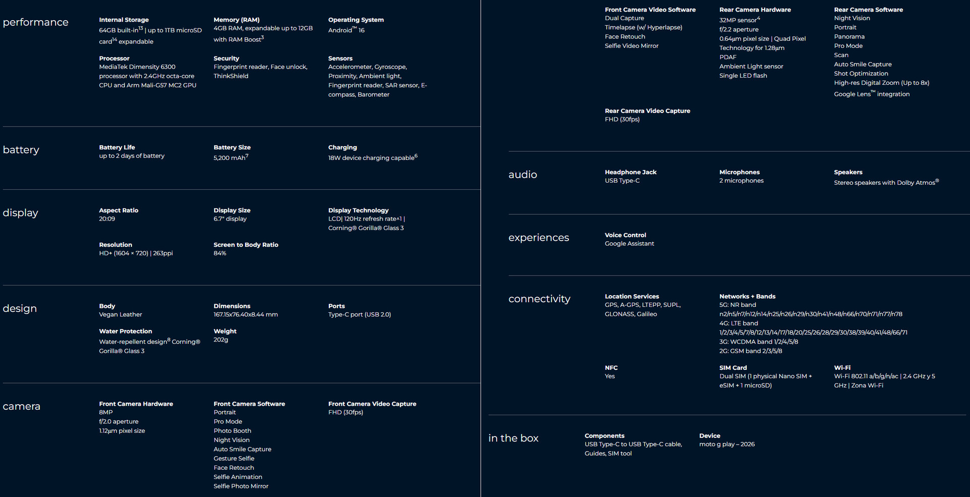 Podobnie jak wariant bez Play, Moto G Play (2026) jest zasilany przez Dimensity 6300, średniej klasy SoC z 2024 roku. Jest on sparowany z 64 GB pamięci UFS 2.2 i 4 GB pamięci RAM. Motorola oferuje opcję rozszerzenia tej ostatniej za pomocą funkcji wirtualnego zwiększenia pamięci RAM, umożliwiając uzyskanie do 8 GB dodatkowej pamięci. Dostępne jest gniazdo microSD, umożliwiające użytkownikom zainstalowanie karty o pojemności do 1 TB (SanDisk 512GB Ultra obecnie 37,99 USD na Amazon).