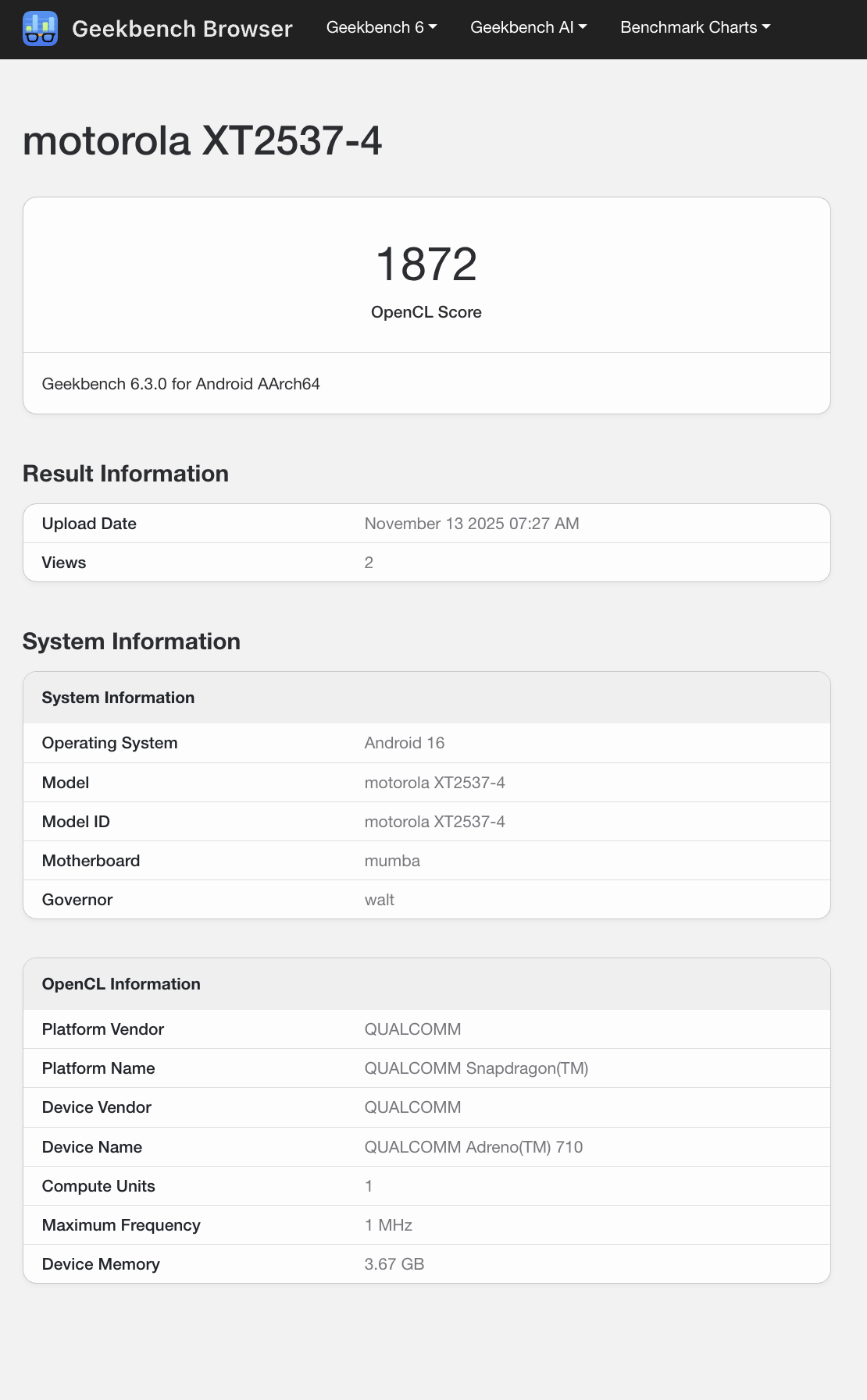 Niemniej jednak, kolejny nowy model pojawił się w Geekbench przed jego oficjalną premierą. Obecnie platforma benchmarkowa zwraca jedynie nazwę "Motorola XT2537-4", przy czym XT2534-4 jest wariantem głównego numeru modelu "XT2537". Mając to na uwadze, wiele źródeł wskazuje, że XT2537 odnosi się do Moto G76, bezpośredniego następcy Moto G75 który został wprowadzony na rynek w październiku ubiegłego roku z chipsetem Snapdragon 6 Gen 3. Dla kontrastu, wydaje się, że Moto G76 zawiera Snapdragon 6s Gen 4, chipset, który Qualcomm zaprezentował niecały miesiąc temu.