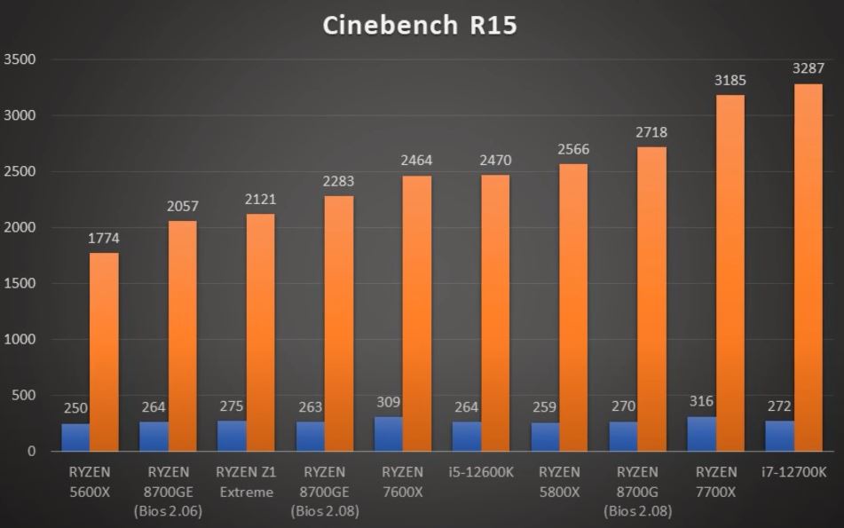 Oba SKU mają podobną liczbę rdzeni i zegarów, w tym 8 rdzeni Zen 4 osiągających do 5,1 GHz i 12 rdzeni RDNA 3. Pomimo tego, że jest to próbka inżynieryjna, GucksTV przeprowadził dokładny szereg testów, ujawniając imponującą wydajność 8700GE w ramach ograniczeń mocy.