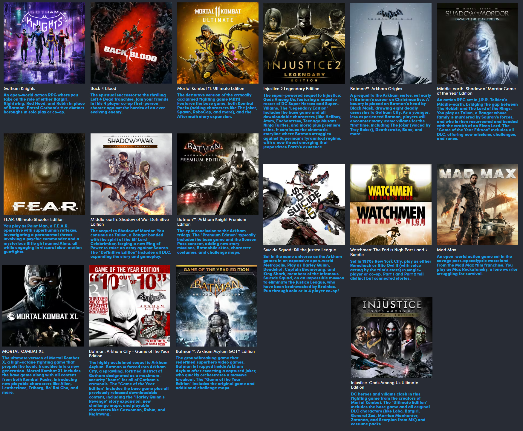 - Mortal Kombat 11: Ultimate Edition - kolekcja zawierająca podstawową grę i trzy dodatki DLC. Pakiet ten kosztuje 59,99 USD (najniższa cena w historii na Steam: 8,99 USD), a podstawowa gra ma obecnie 86% pozytywnych ocen. Gra działa również dobrze na Steam Deck z kilkoma poprawkami.