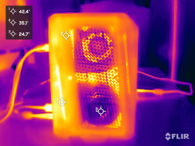 Asus ROG NUC 15 posiada wydajny system chłodzenia, który skutecznie i stosunkowo cicho chłodzi procesor i kartę graficzną. Na biegu jałowym mini PC działa ledwo słyszalnie na poziomie około 30 dB(A), chociaż pod obciążeniem może osiągnąć nawet 45 dB(A). Podczas grania poziom hałasu jest czasami na tym samym poziomie, co w teście obciążeniowym.