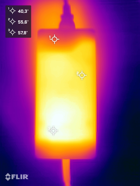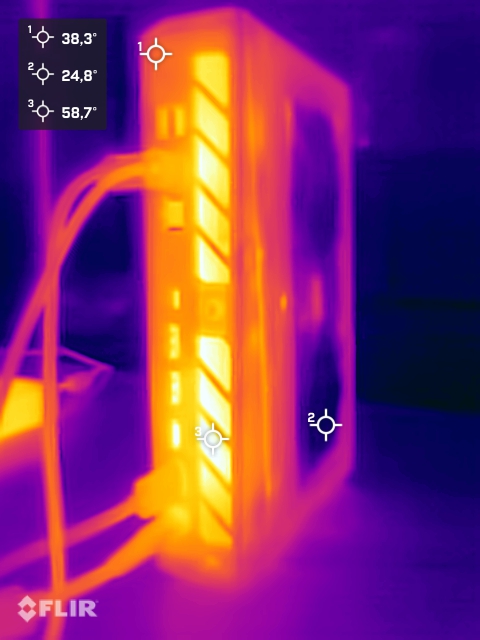 Temperatury obudowy w Asus ROG NUC 15 pozostają bezkrytyczne. Niektóre obszary nagrzewają się bardziej. Nie występują jednak wartości ekstremalne. Procesor Intel Core Ultra 9 275HX tylko na chwilę osiąga temperaturę 80 °C, dzięki czemu pozostaje przyjemnie chłodny. GPU laptopa Nvidia GeForce RTX 5080 działa średnio w temperaturze 77 °C przy normalnym zużyciu energii na poziomie 120 W.