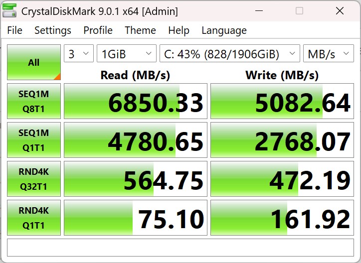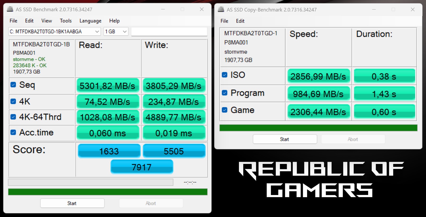 Asus ROG NUC 15 jest wyposażony w dysk SSD M.2 o pojemności 2 TB firmy Micron, który działa z pełną prędkością PCIe 4.0x4. Wydajność jest wystarczająca, aby zapewnić dobre miejsce w połowie stawki. Ponadto wydajność pozostaje stała i bez spadków nawet pod obciążeniem. W urządzeniu można zainstalować łącznie dwa dyski SSD M.2 2280.