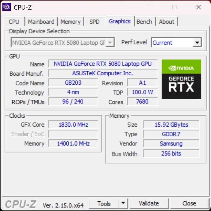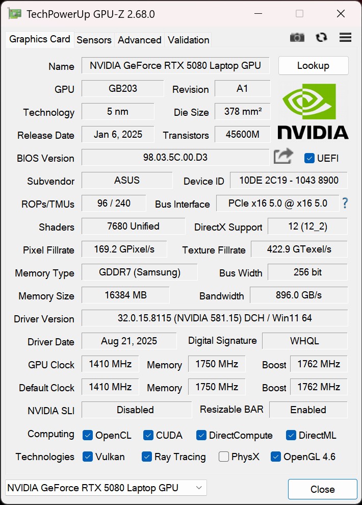 Dzięki procesorowi graficznemu Nvidia GeForce RTX 5080 z 16 GB pamięci VRAM, Asus ROG NUC 15 wyznacza nowe standardy w swojej klasie wielkości. W porównaniu wydajności jest wyraźnie na szczycie i oferuje wydajność w grach na najwyższym poziomie. Chociaż porównanie z desktopową wersją RTX 5080 nie jest tak dokładne, pokazuje imponująco, jak blisko mini PC zbliża się do systemów high-end. W znacznej odległości za nim plasuje się Minisforum AtomMan G7 Ti z laptopowym GPU RTX 4070.