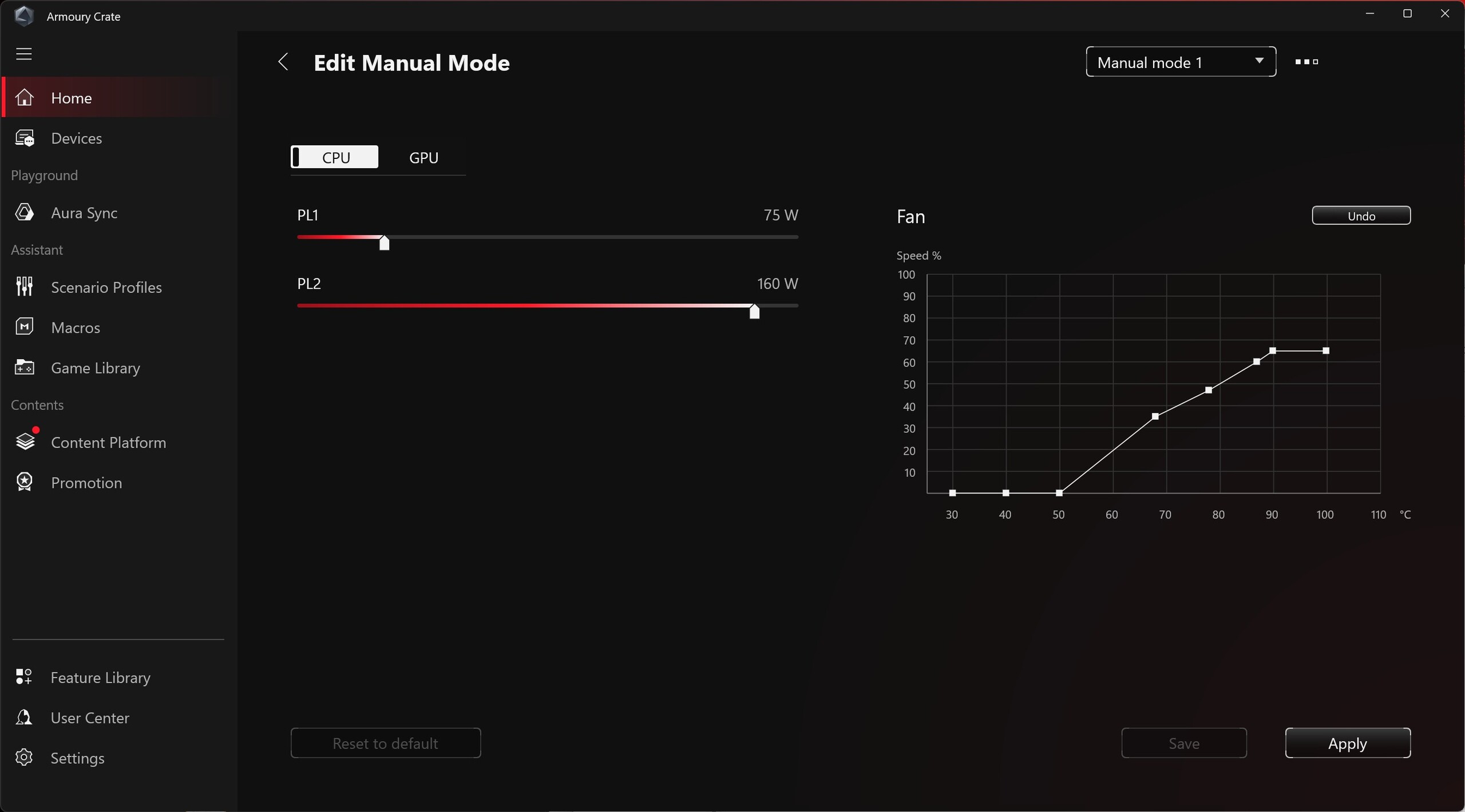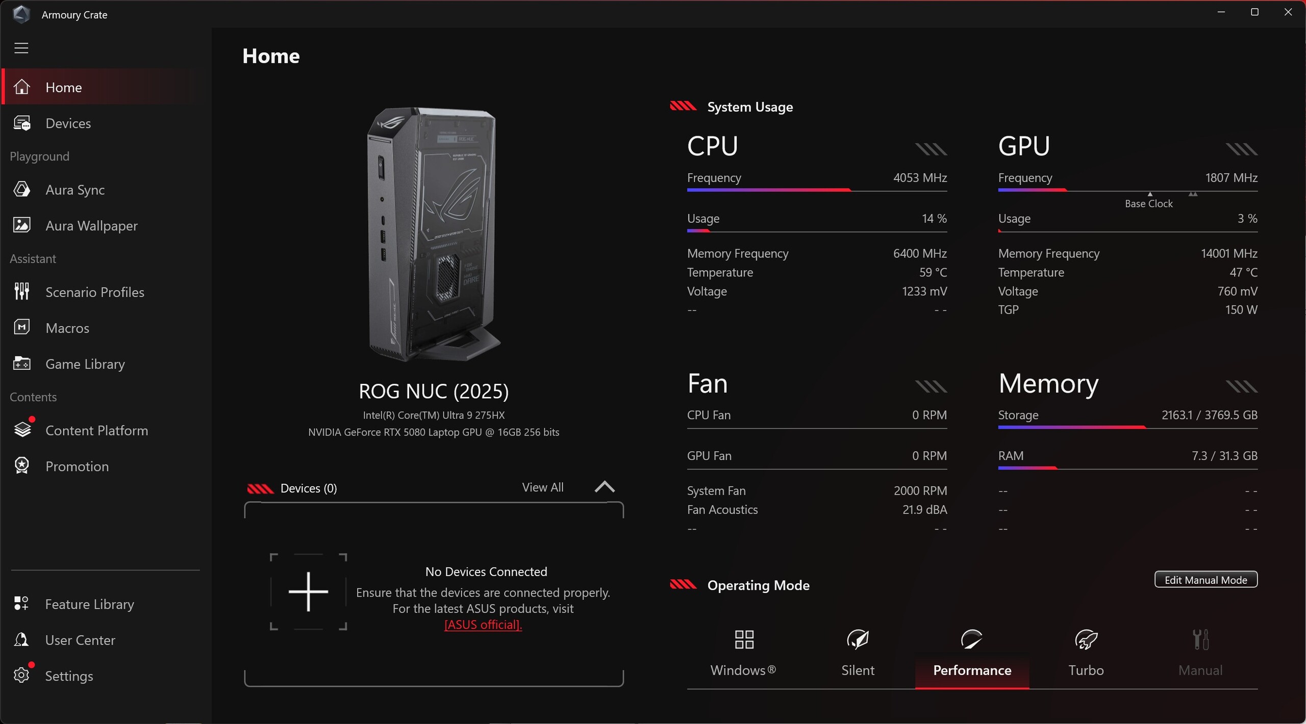 We wszystkich testach wydajności wykorzystaliśmy profil energetyczny "Wydajność". Rozbudowany UEFI oferuje wiele możliwości personalizacji urządzenia. Można wybrać różne profile wydajności i profile wentylatorów. Wydajność można również łatwo dostosować w systemie operacyjnym Windows za pomocą dobrze znanego narzędzia Armoury Crate.
