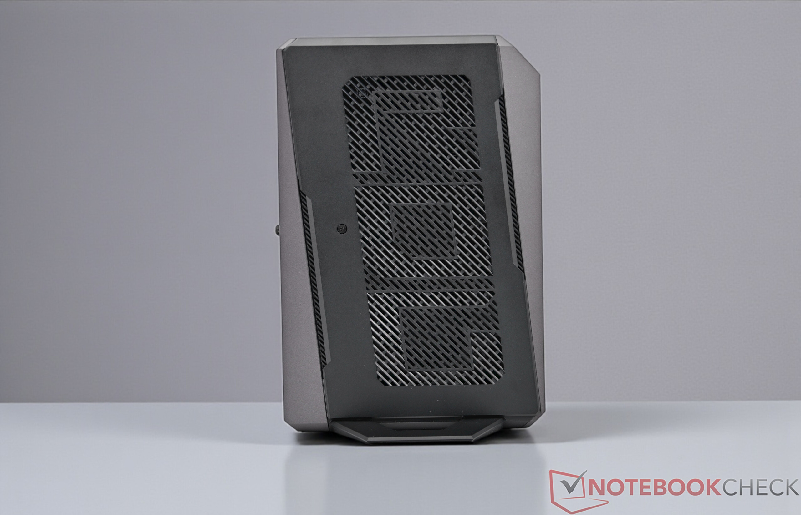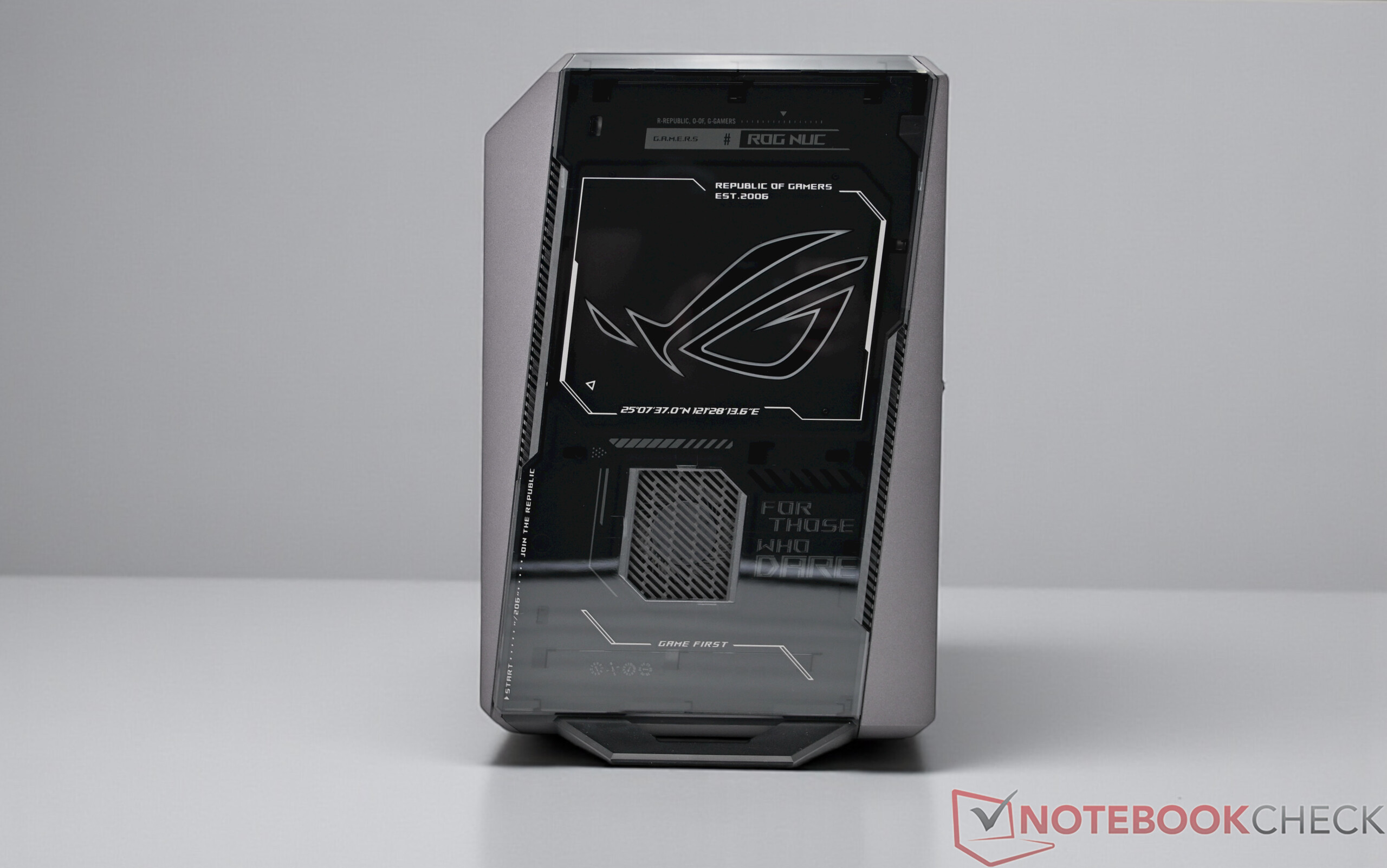 Asus ROG NUC 15 łączy w sobie kompaktową konstrukcję z wydajnym chłodzeniem i solidnym wykonaniem. Chociaż obudowa jest nieco większa, ROG NUC 15 zachowuje oszczędność miejsca i elastyczność. Można ją ustawić pionowo, co również poprawia cyrkulację powietrza. Obudowa łączy plastik na zewnątrz z wytrzymałym metalem wewnątrz, a podświetlane logo ROG z Aura Sync zapewnia akcenty. Przy wadze około 3,0 kg, mini PC jest jednym z cięższych modeli, ale nadal oferuje udaną równowagę między wydajnością, wzornictwem i praktycznością.