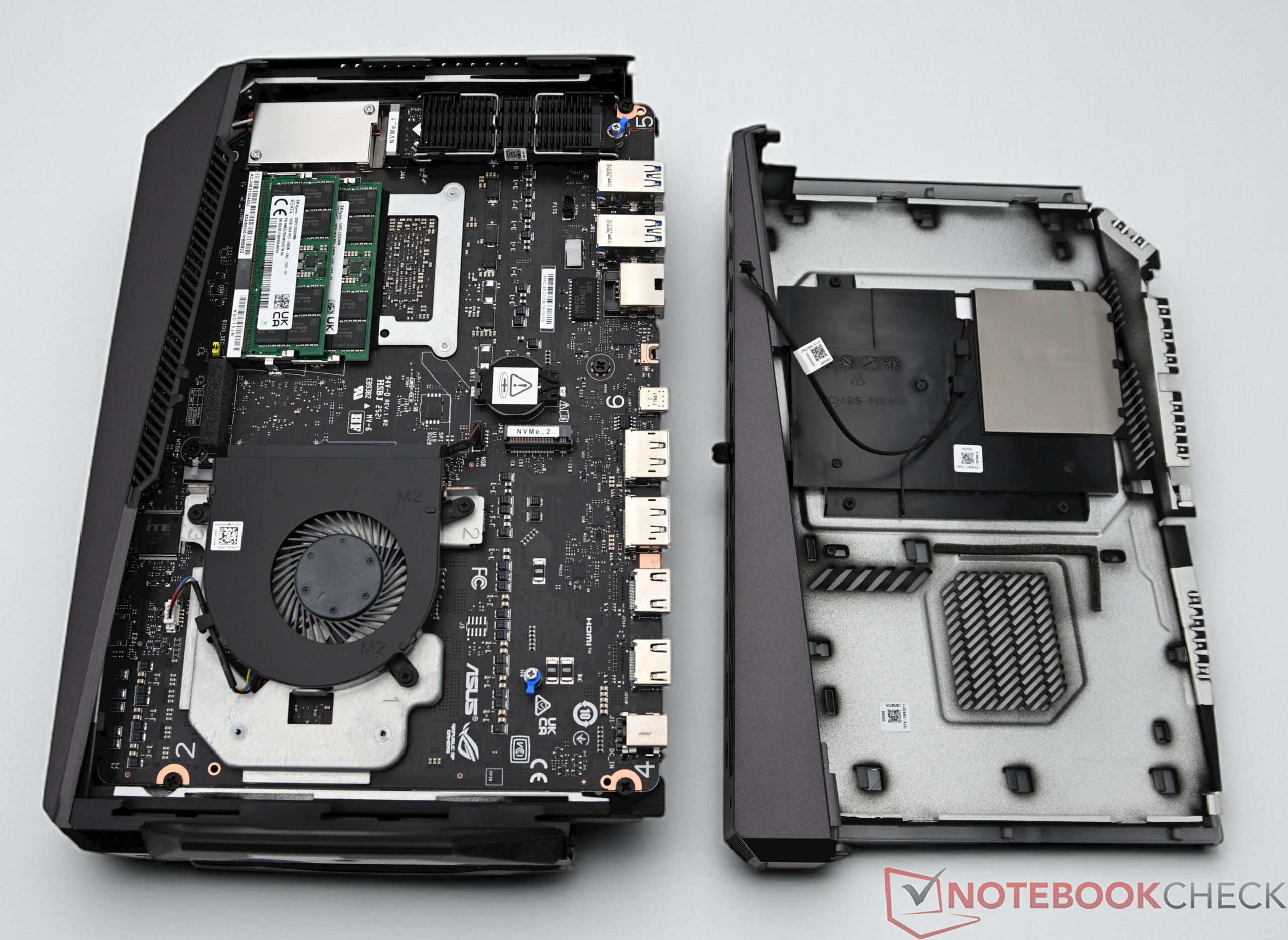 Prace konserwacyjne na Asus ROG NUC 15 są możliwe bez żadnych problemów. Asus zrezygnował ze skomplikowanych połączeń śrubowych, dzięki czemu dostęp do pamięci RAM i dysku SSD jest łatwy. Po zdjęciu panelu bocznego jest miejsce na maksymalnie dwa dyski SSD M.2. W razie potrzeby można również wymienić moduł WLAN.
