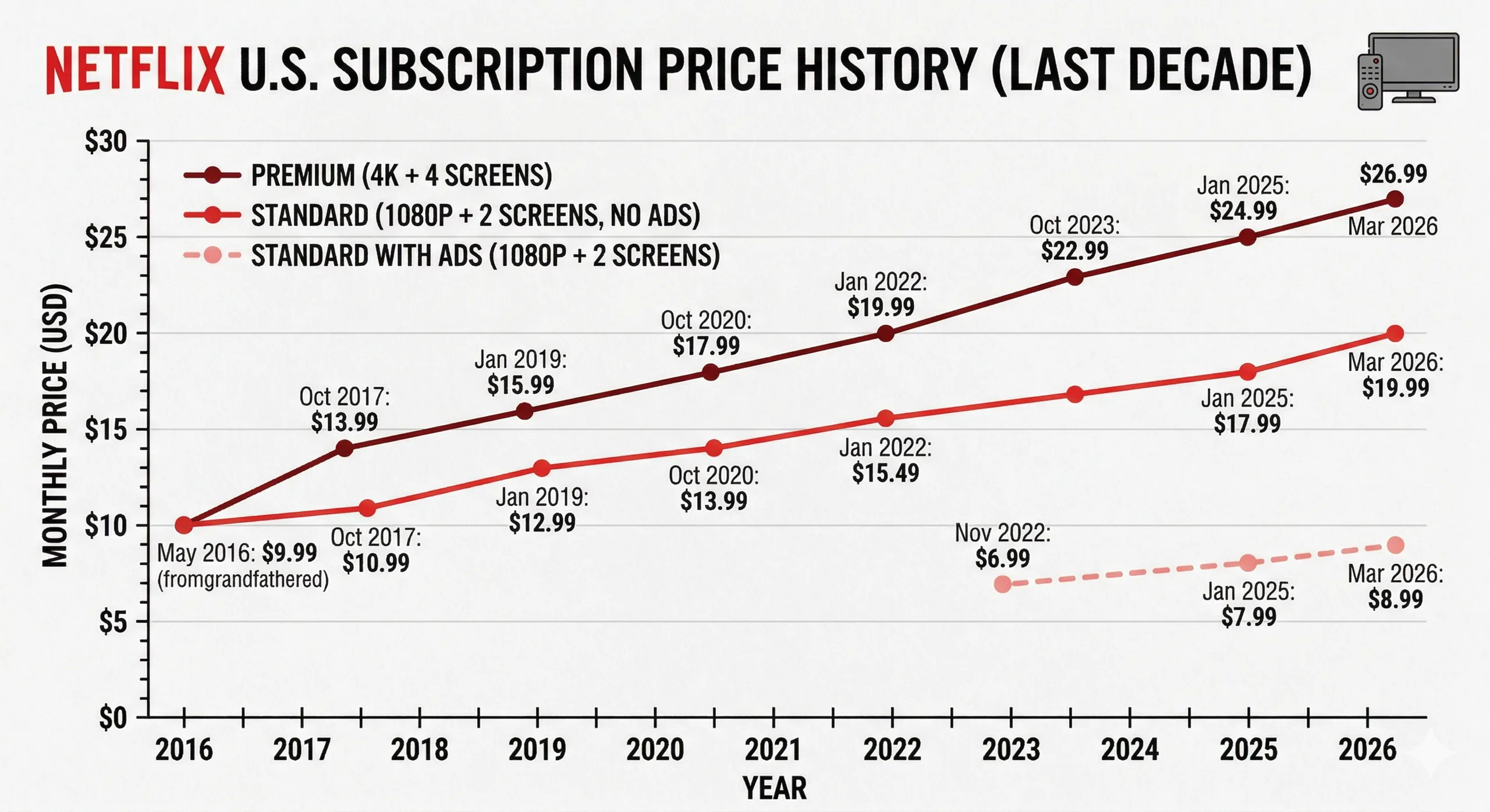 Netflix właśnie podniósł ceny subskrypcji w USA po raz drugi w ciągu roku. Nowa matematyka zaczyna wyglądać jak bezpośredni podatek od sprzętu. Od 26 marca 2026 r. poziom Premium 4K wzrósł do 26,99 USD miesięcznie, podczas gdy poziom podstawowy z reklamami wydaje się być bardziej zakotwiczony na poziomie 8,99 USD. Tworzy to ogromną różnicę cenową, która w zasadzie zmusza do wyboru między dwiema rzeczami, które kiedyś były uważane za standardowe: rozdzielczością ekranu i prywatnością nawyków. Jeśli kupili Państwo wysokiej klasy laptopa, takiego jak MacBook Pro M5 specjalnie ze względu na jego szczytową jasność 1600 nitów i wyświetlacz Mini LED, Netflix pobiera teraz dużą roczną opłatę tylko po to, aby zobaczyć, co faktycznie potrafi ten ekran.