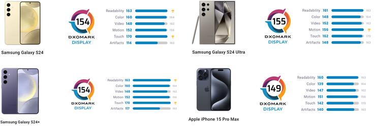 Co ciekawsze, wyświetlacz tańszego modelu uzyskał lepsze wyniki niż S24 Ultra w testach dotykowych i czytelności. Standardowy Galaxy S24 jest obecnym liderem w tych dwóch czynnikach, osiągając odpowiednio 170 i 163 punkty. Teraz, chociaż pokonuje iPhone'a 15 Pro Max, należy wziąć pod uwagę, że różnica w wynikach nie jest duża.