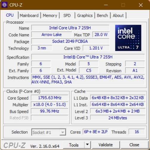 Procesor Intel Core Ultra 255H to procesor Arrow Lake H z łącznie 16 rdzeniami (sześć rdzeni Lion Cove P o taktowaniu do 5,1 GHz; osiem rdzeni Skymont E o taktowaniu do 4,4 GHz; dwa rdzenie Low Power E o taktowaniu do 2,5 GHz). Procesor ma typowe TDP na poziomie 28 W, ale może zużywać do 115 W, jeśli producent tak ustawi. Więcej porównań benchmarkowych jest możliwych dzięki naszej Lista porównawcza procesorów.