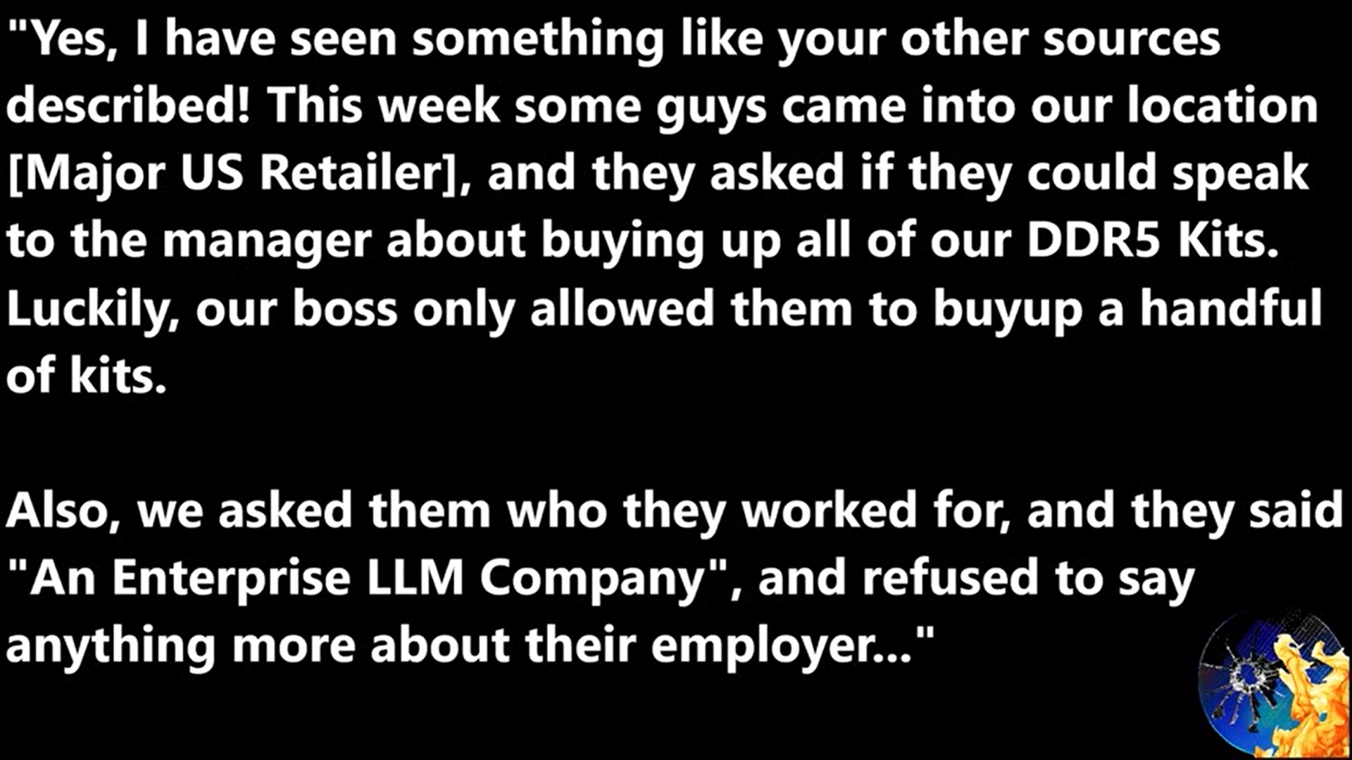 Według Moore's Law Is Dead, OpenAI nie tylko gromadzi większość globalnej podaży pamięci, ale także rzekomo wykupuje konsumenckie zestawy DDR5. Pracownicy OpenAI podobno chodzą do sklepów detalicznych i próbują zdobyć jak najwięcej zestawów DDR5. Informacje dotarły do MLID z kilku źródeł, w tym od sprzedawców detalicznych i dostawców pamięci RAM.