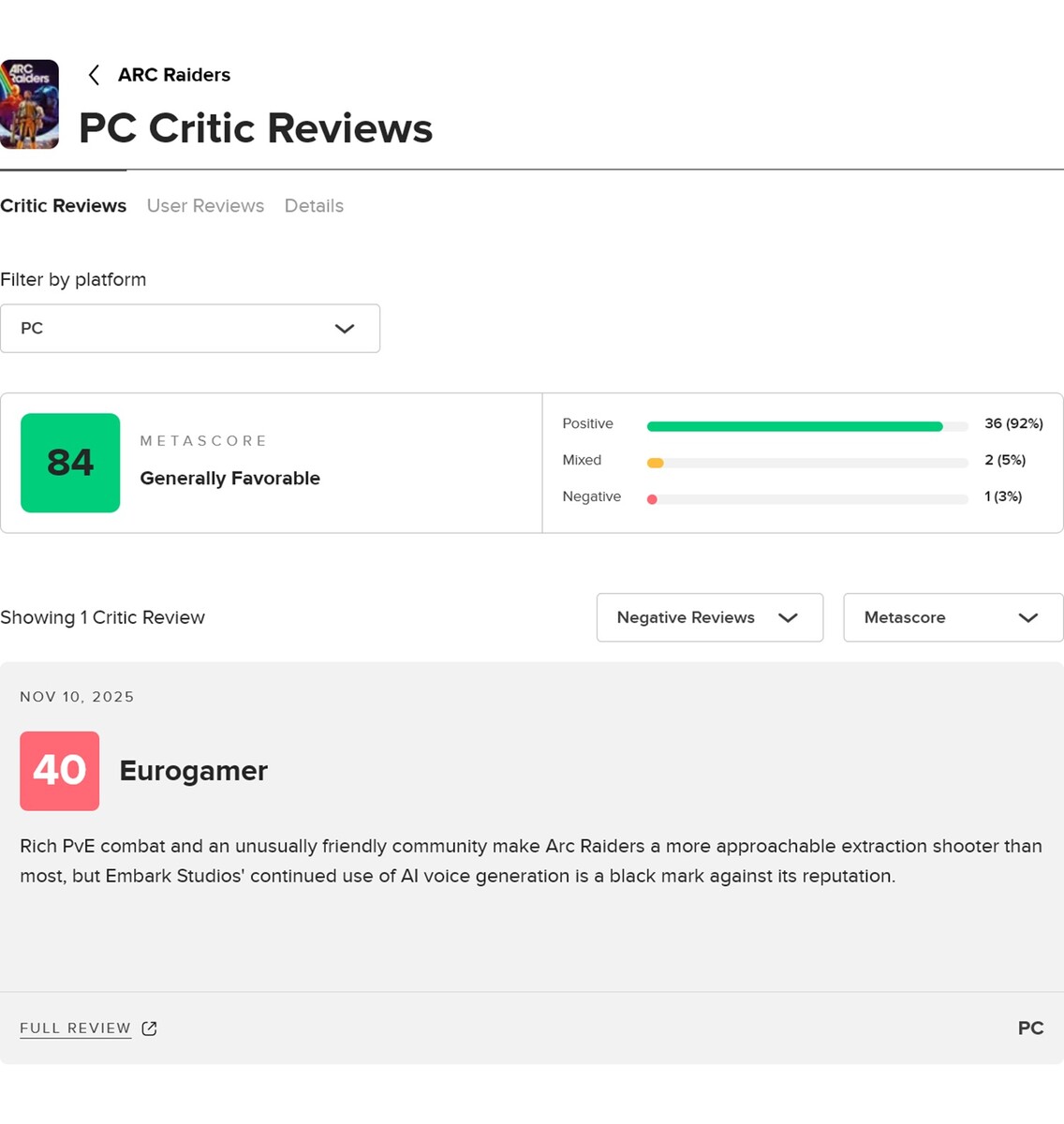Wydobywcza strzelanka Embark Studios Arc Raiders przekroczyła oczekiwania co do liczby graczy. Opinie mediów są również pozytywne, z oceną 84 Metacritic. Jednak jeden wynik wyróżnia się jak bolesny kciuk, jako jedyna negatywna recenzja Arc Raiders na agregatorze. Eurogamer przyznał grze ocenę 2/5, głównie ze względu na jej wykorzystanie generatywnej sztucznej inteligencji.
