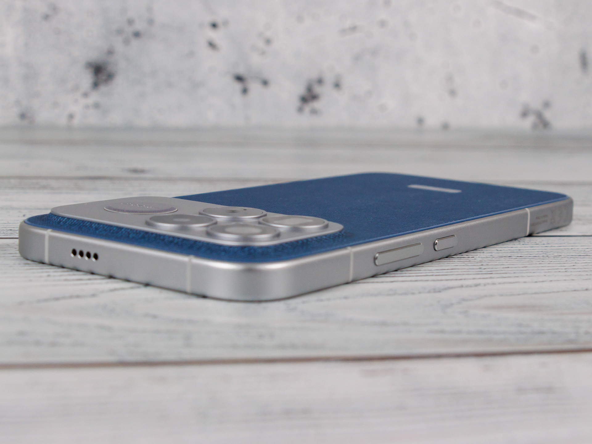 Poco F8 Ultra jest dostępny w wariantach kolorystycznych Black i Denim Blue. W czarnym modelu ramka jest matowo czarna, a tylny panel wykonano z kompozytu włókna szklanego. Z kolei w niebieskiej wersji zastosowano nanomateriał na bazie żywicy silikonowej, zaprojektowany tak, aby naśladować wygląd dżinsu, w połączeniu z matową srebrną aluminiową ramą. Obudowa ma nominalną grubość 8,3 mm, co udało nam się potwierdzić. Łącznie z modułem kamery, grubość wzrasta do 11,9 mm.