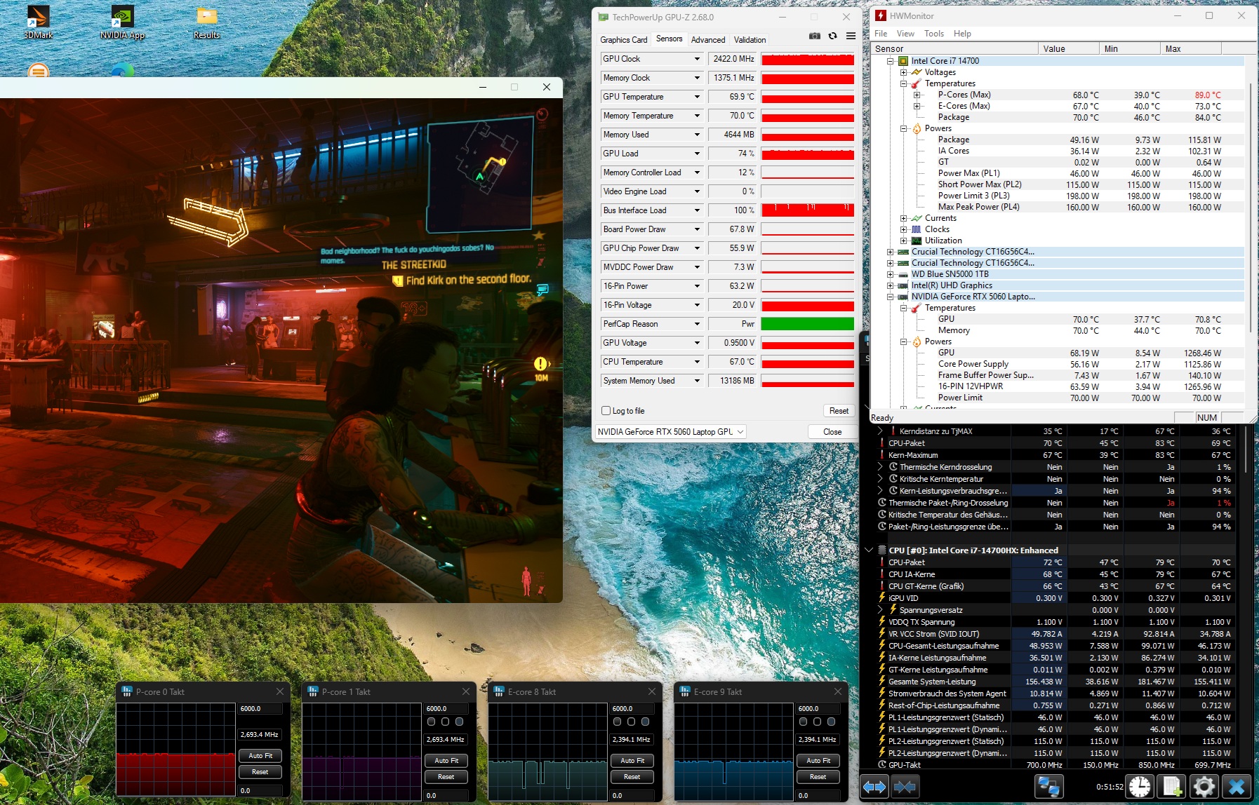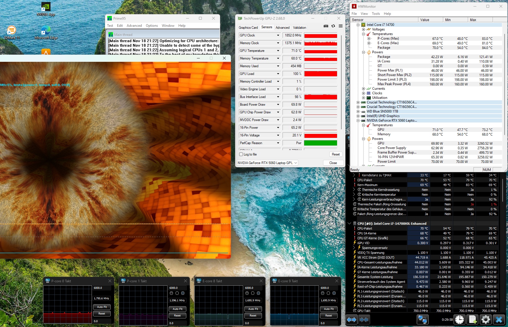 Dławiony Core i7-14700HX ukończył połączony test obciążeniowy Furmark i Prime95 przy około 70 °C, co jest całkowicie nieszkodliwe. Karta GeForce RTX 5060 również osiągnęła poziom około 70 °C.