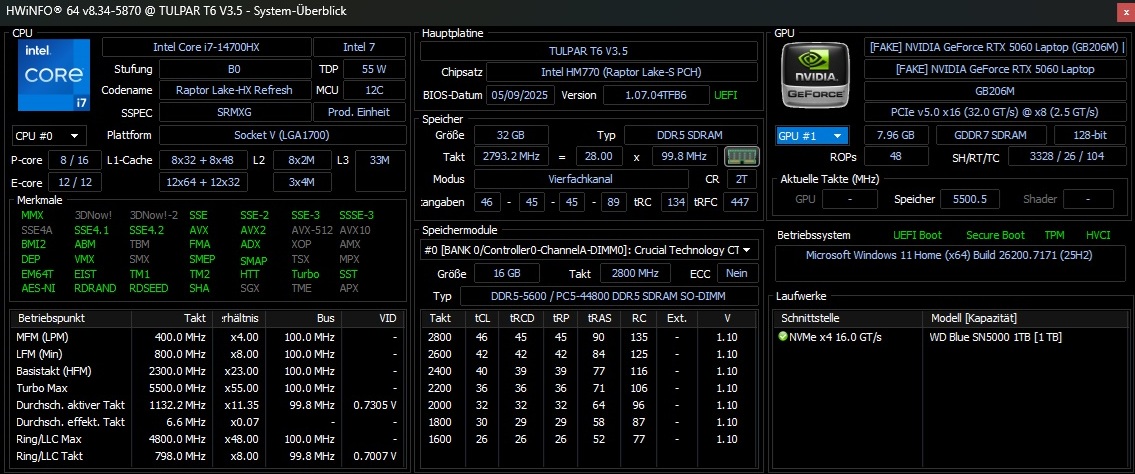 Jeśli szukają Państwo aktualnego laptopa do gier w przedziale 1000 euro, to T6 V3.5 od Tulpar Notebook może być dobrym wyborem. Dzięki GeForce RTX 5060, 16-calowy model oferuje solidny GPU średniej klasy w połączeniu z szybkim procesorem Core i7-14700HX (który jednak traci nieco na wydajności przy długotrwałym obciążeniu). Nasza jednostka testowa zawierała również 32 GB pamięci RAM DDR5 (2×16 GB) i dysk SSD NVMe o pojemności 1 TB.