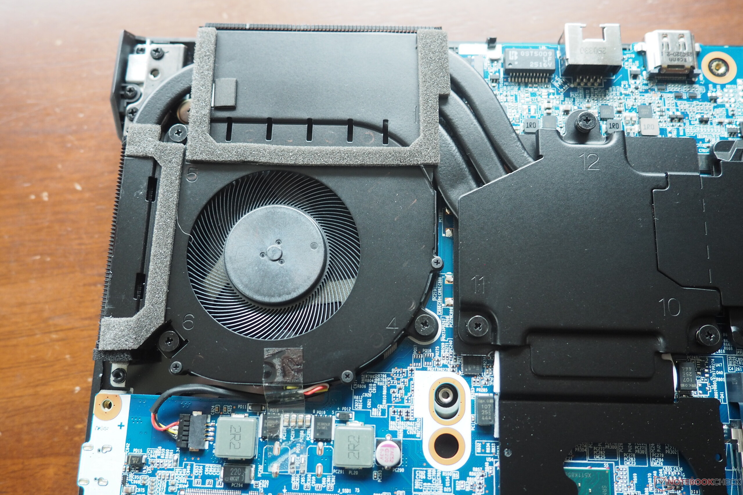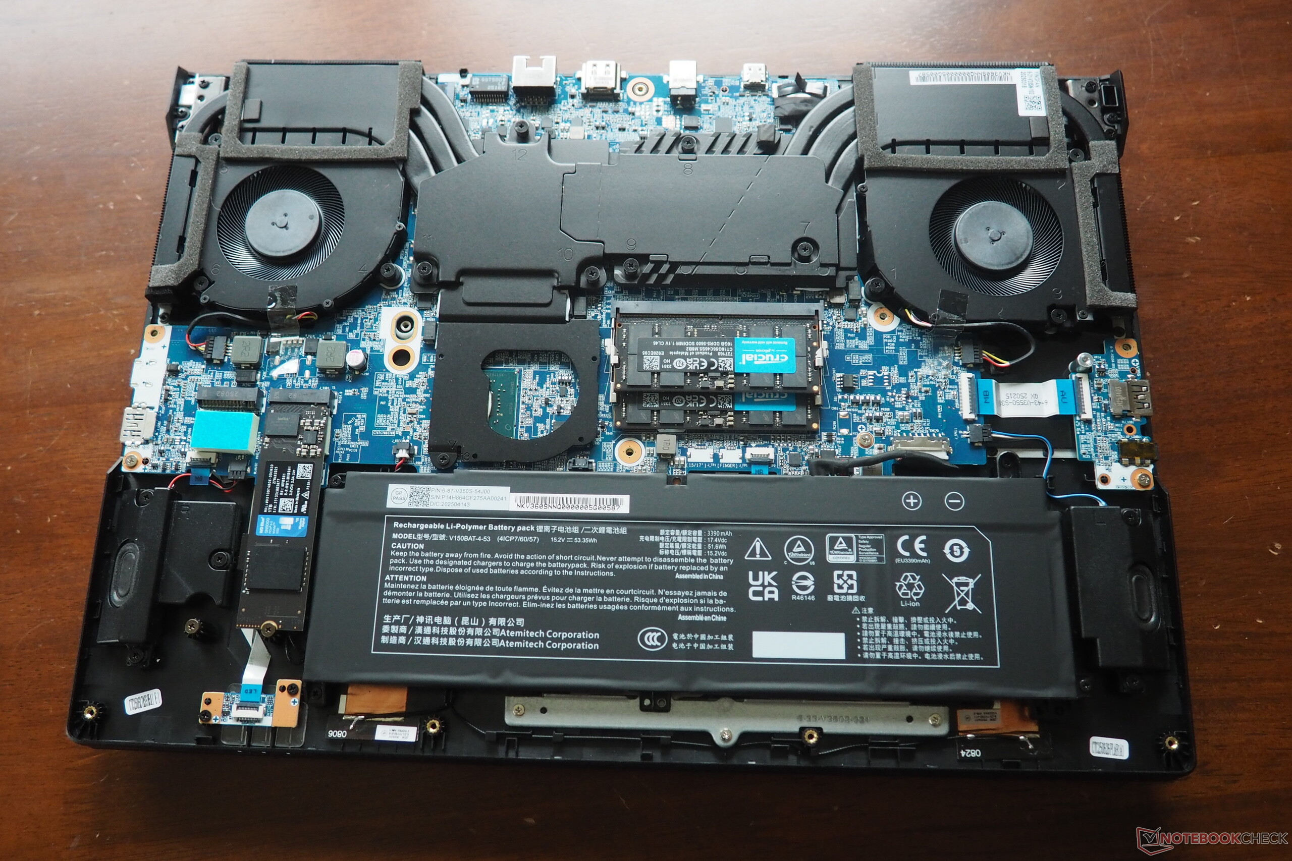 Aby podważyć dolną pokrywę, należy odkręcić dwanaście śrub krzyżakowych. Pod maską znajdziemy układ chłodzenia z dwoma wentylatorami, a także dwa sloty na pamięć RAM i dwa sloty na dyski SSD. Bateria jest również dostępna z tego miejsca.